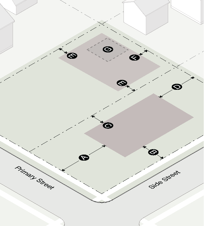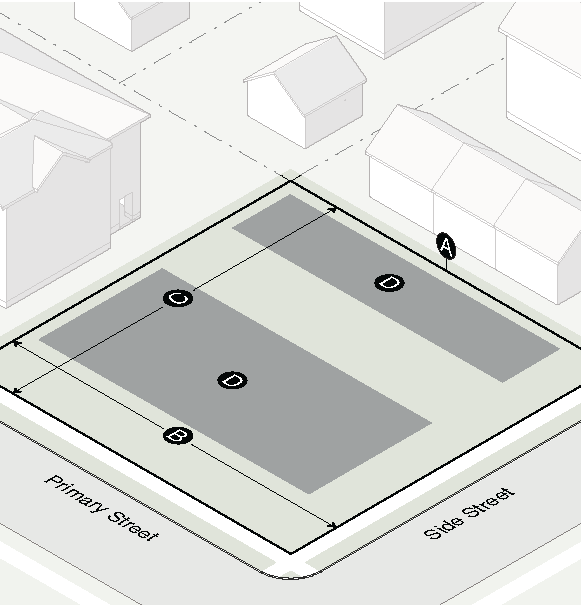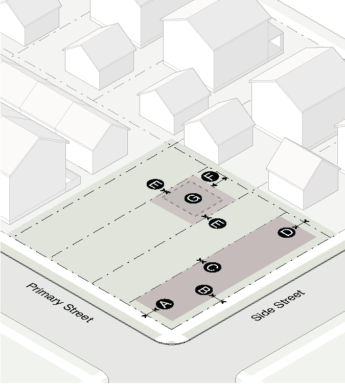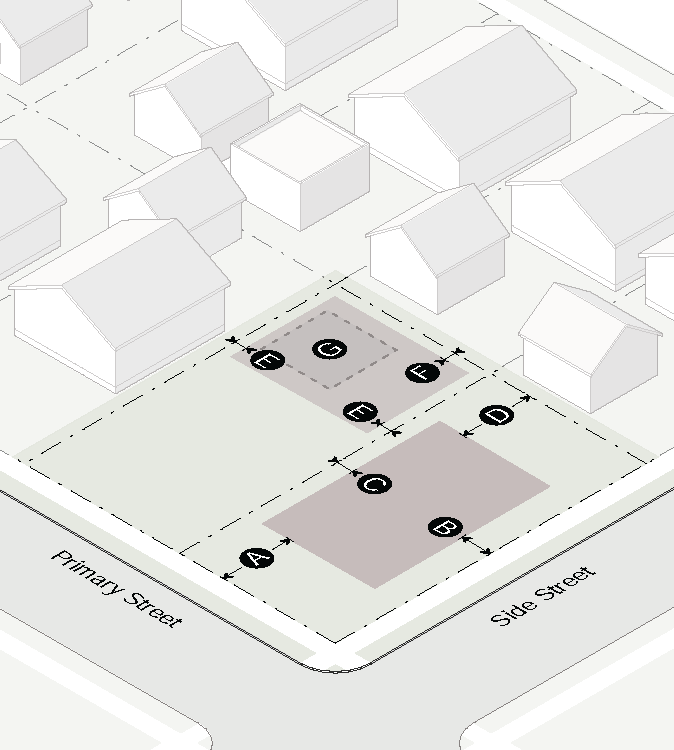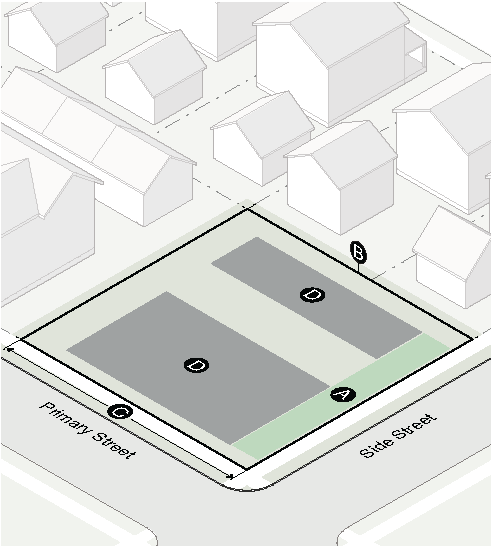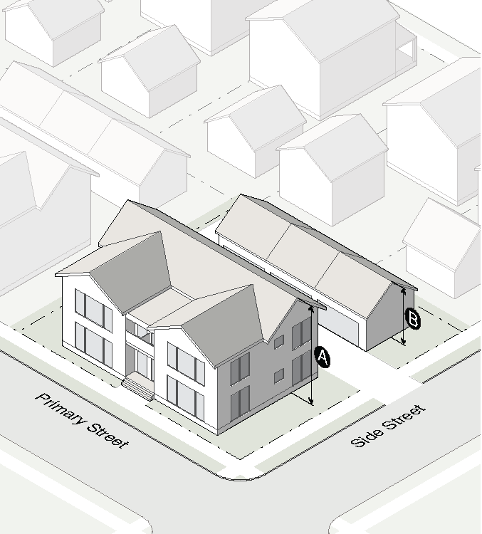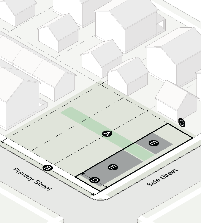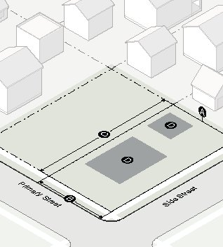 Garage doors must face the side interior or rear lot line and must be accessed by an alley or driveway.