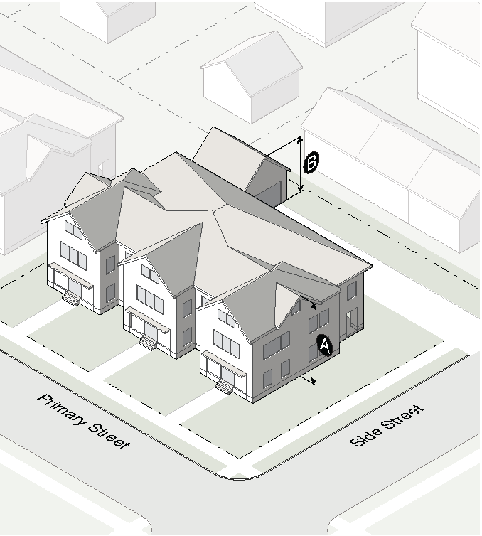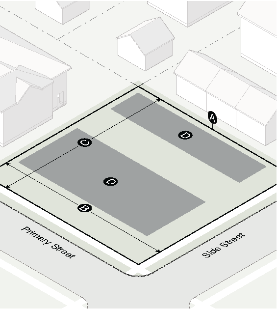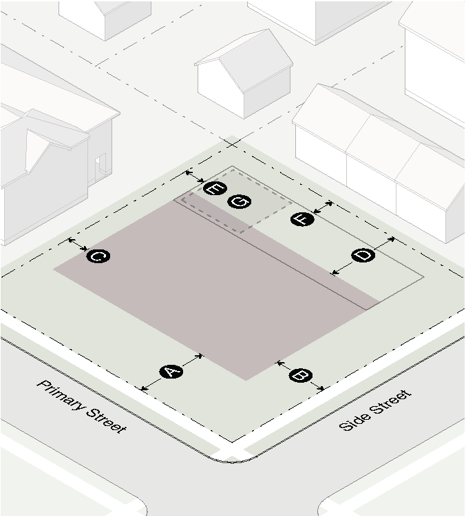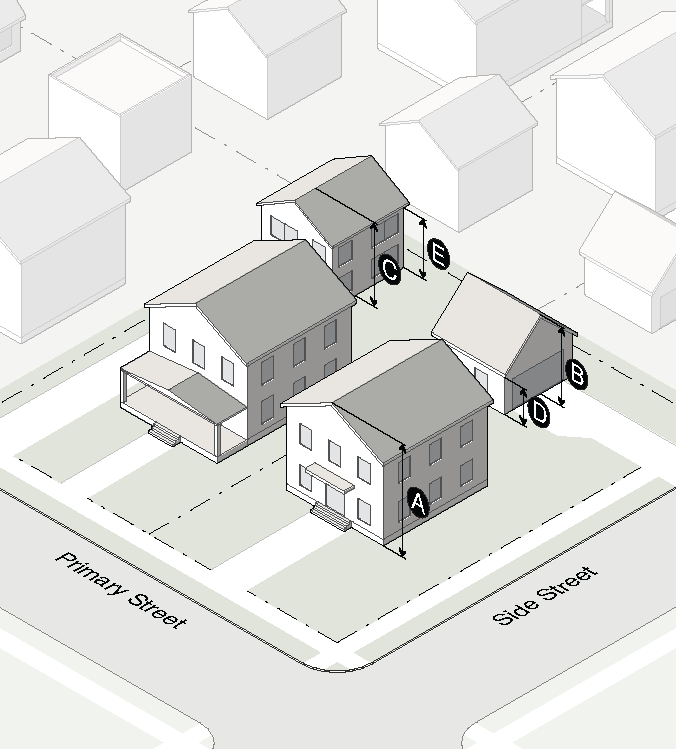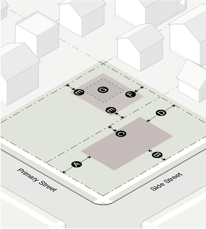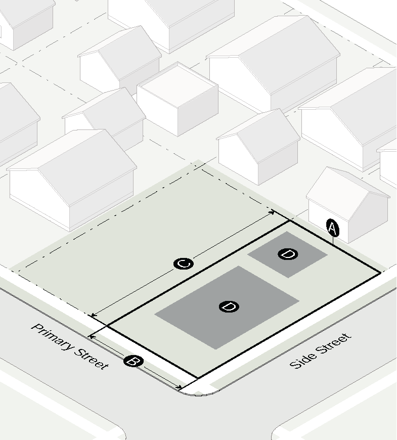Garage doors must face the side interior or rear lot line and must be accessed by an alley or driveway.