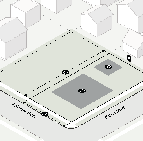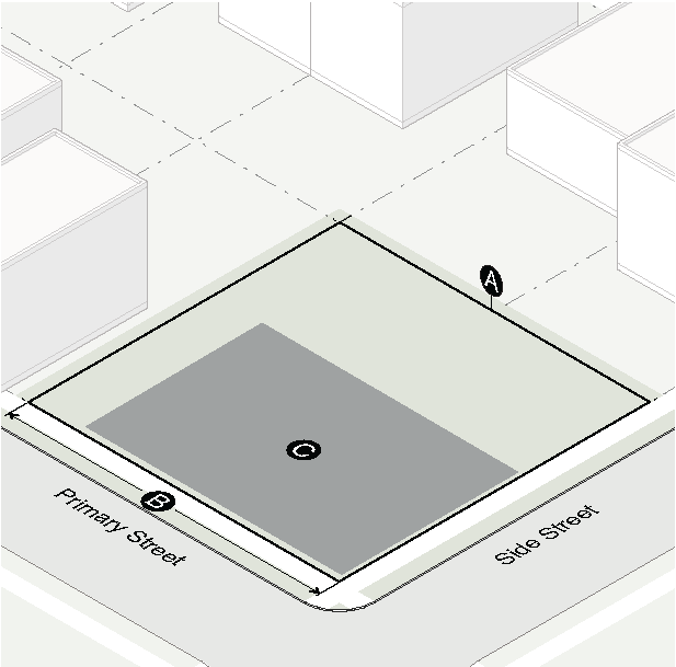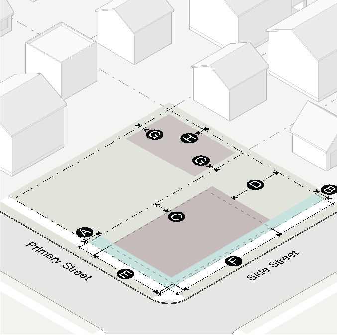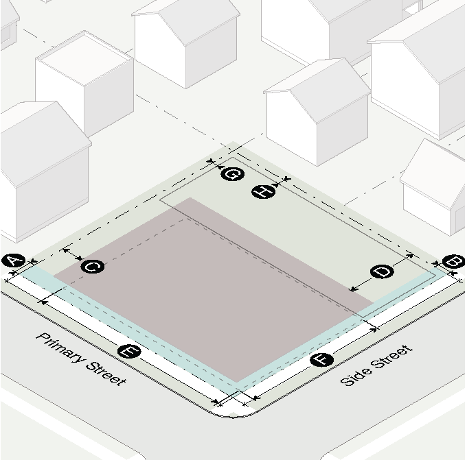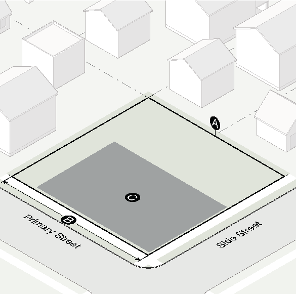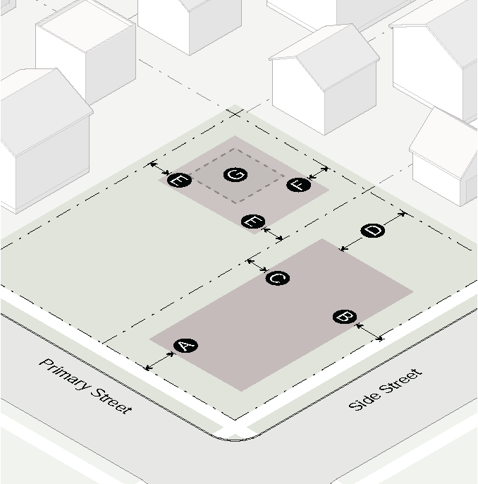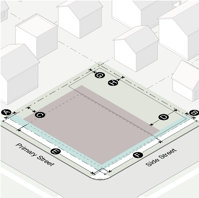 Gasoline fuel dispenser structures and associated vehicular services such as air pumps and car washes shall not be located between a building and the street.