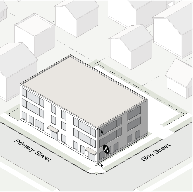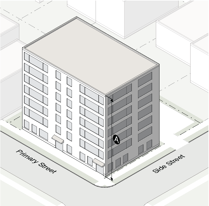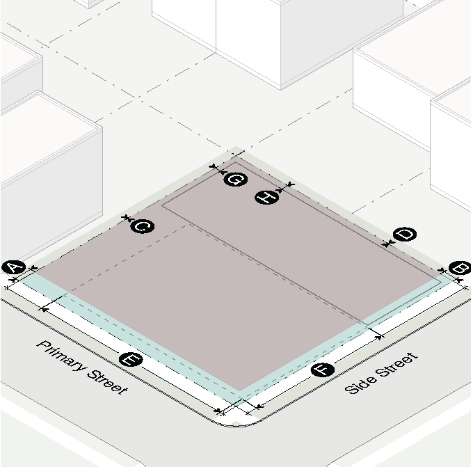 There are no requirements for transitional buffers, height planes, or step-backs when both properties in question are located within the district.