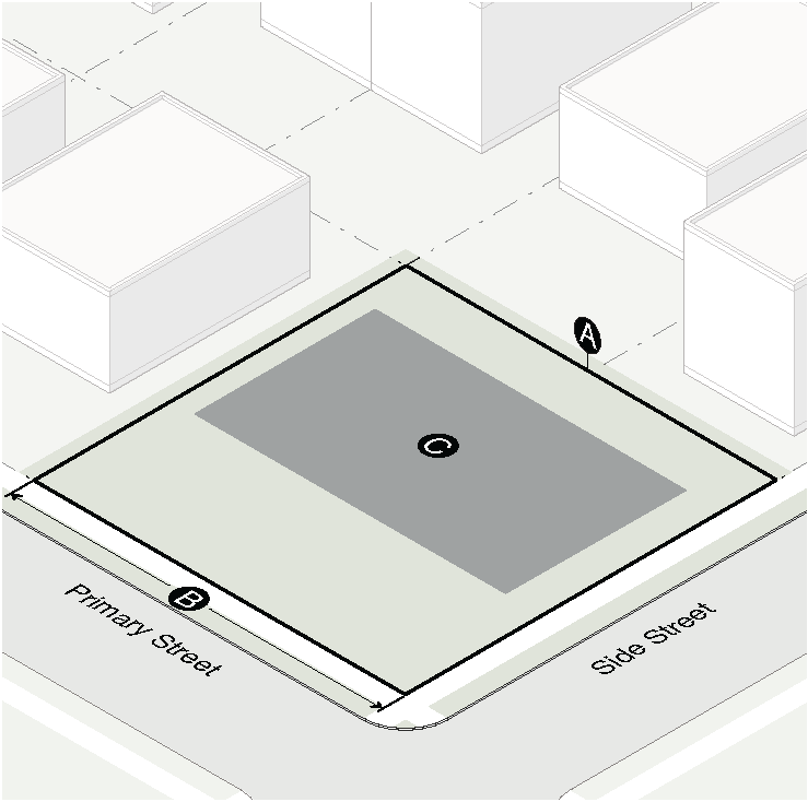 No continuous building facade facing residential shall exceed 250 feet in width without a plaza, green space or pocket park at the sidewalk measured from the face of the building with a minimum width and depth of 40 feet.