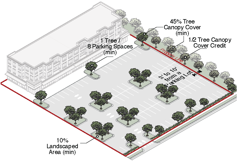Additional tree canopy cover must be planted to achieve 45% tree canopy cover across the site, including tree canopy provided by streetscape installations on public rights-of-way. If replacement trees are required, a minimum of 50% of the property's tree canopy cover replacement must be accommodated on site, including adjacent public rights-of-way. The remaining 50% may be satisfied by a combination of replacement trees planted on City-owned property or in public rights-of-way, the installation of on-site green infrastructure, the installation of rooftop solar photovoltaic panels (PV), or, upon submission of an affidavit from the property owner attesting that other options have been explored but are infeasible due to site conditions, a payment in lieu fee made to the tree bank.