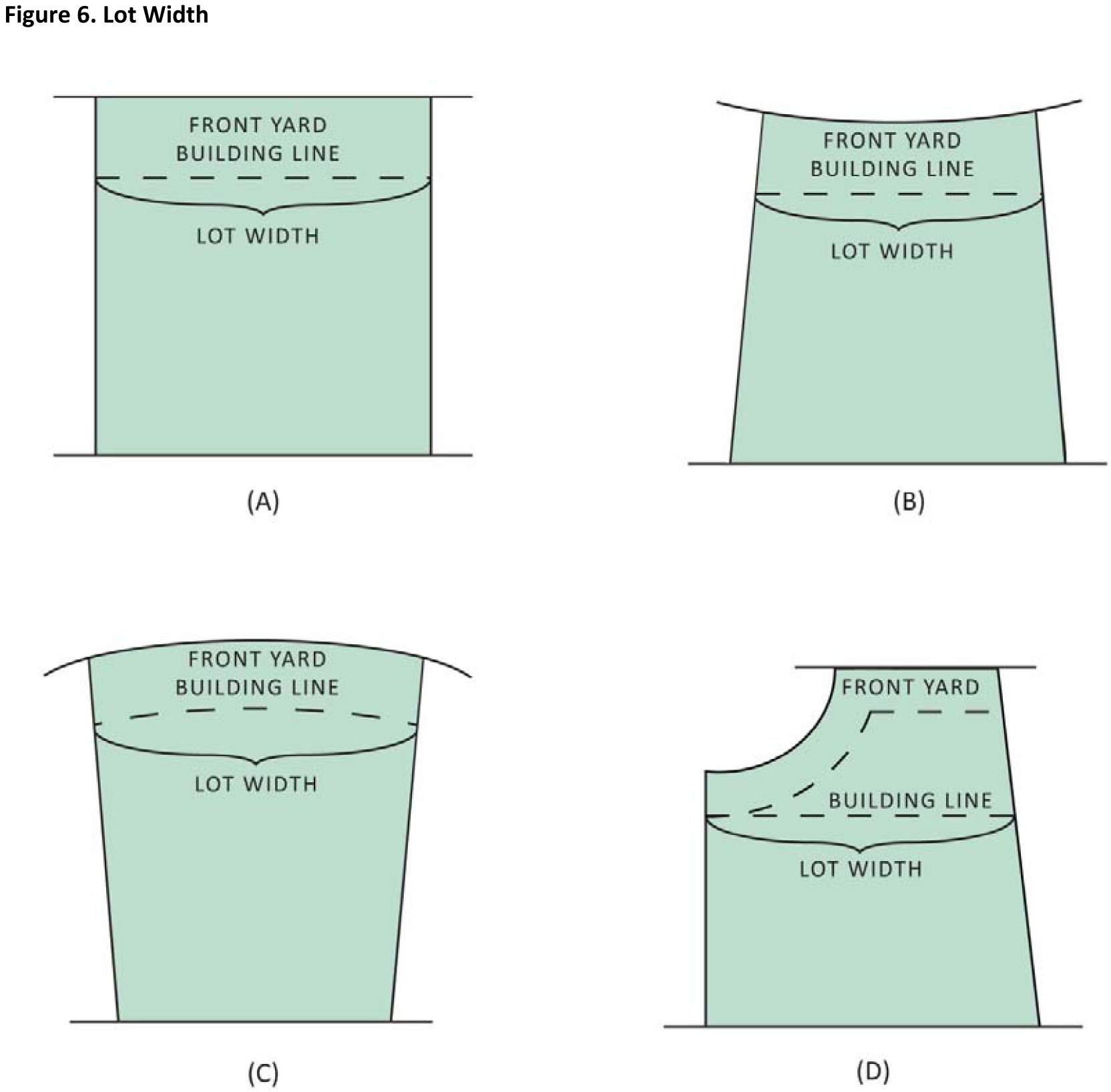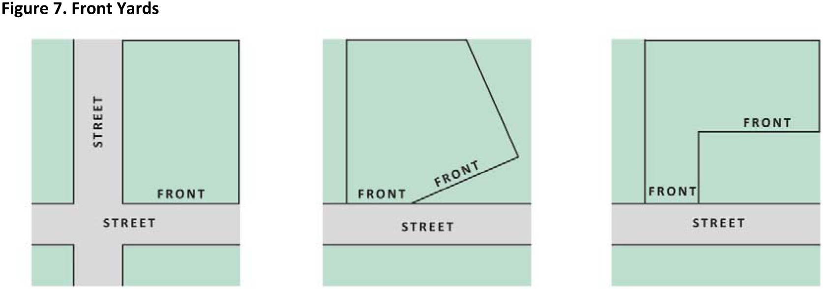 Yard, Front: The open, unoccupied space located in front of the front elevation of the principal building(s), calculated as the minimum horizontal distance between the front property line and the front elevation of the principal building(s) (Figure 7. Front Yards).