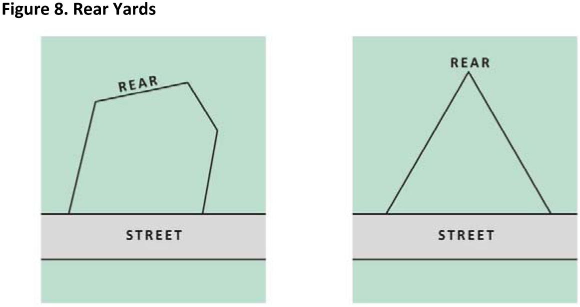Yard, Rear: The open, unoccupied space located behind the rear elevation of the principal building(s), calculated as the minimum horizontal distance between the rear property line and the rear elevation of the principal building(s) (Figure 8. Rear Yards).