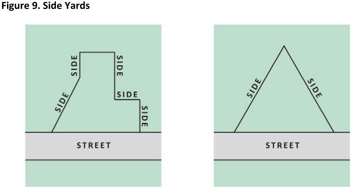 Yard, Side: The open, unoccupied space located on either side of the principal building(s), calculated as the minimum horizontal distance between the side property line and the side elevation of the principal building(s) (Figure 9. Side Yards).