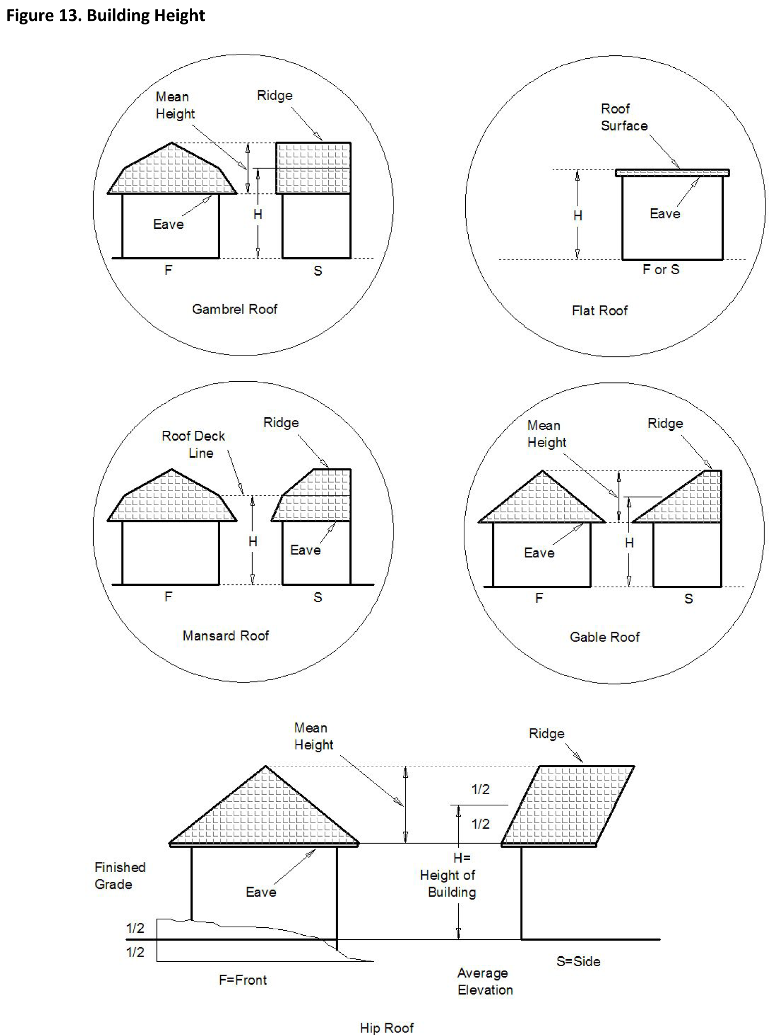 In measuring the height of a building, the following structures shall be excluded: chimneys, cooling towers, elevator bulkheads, penthouses, tanks, water towers, radio and television towers, ornamental cupolas, domes or spires, flagpoles, and parapet walls not exceeding four (4) feet in height (see Figure 13. Building Height).
