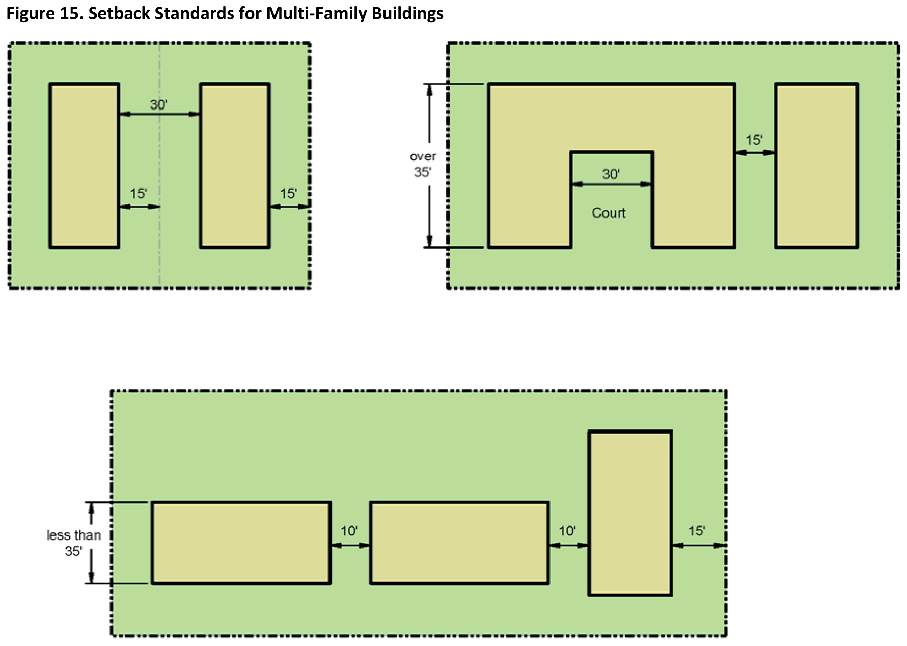 Multiple family dwellings shall provide a minimum separation of fifteen (15) feet between all building walls and any side lot line, except that any such building wall not exceeding thirty-five (35) feet in width may provide a separation of ten (10) feet (Figure 15. Setback Standards for Multi-Family Buildings).