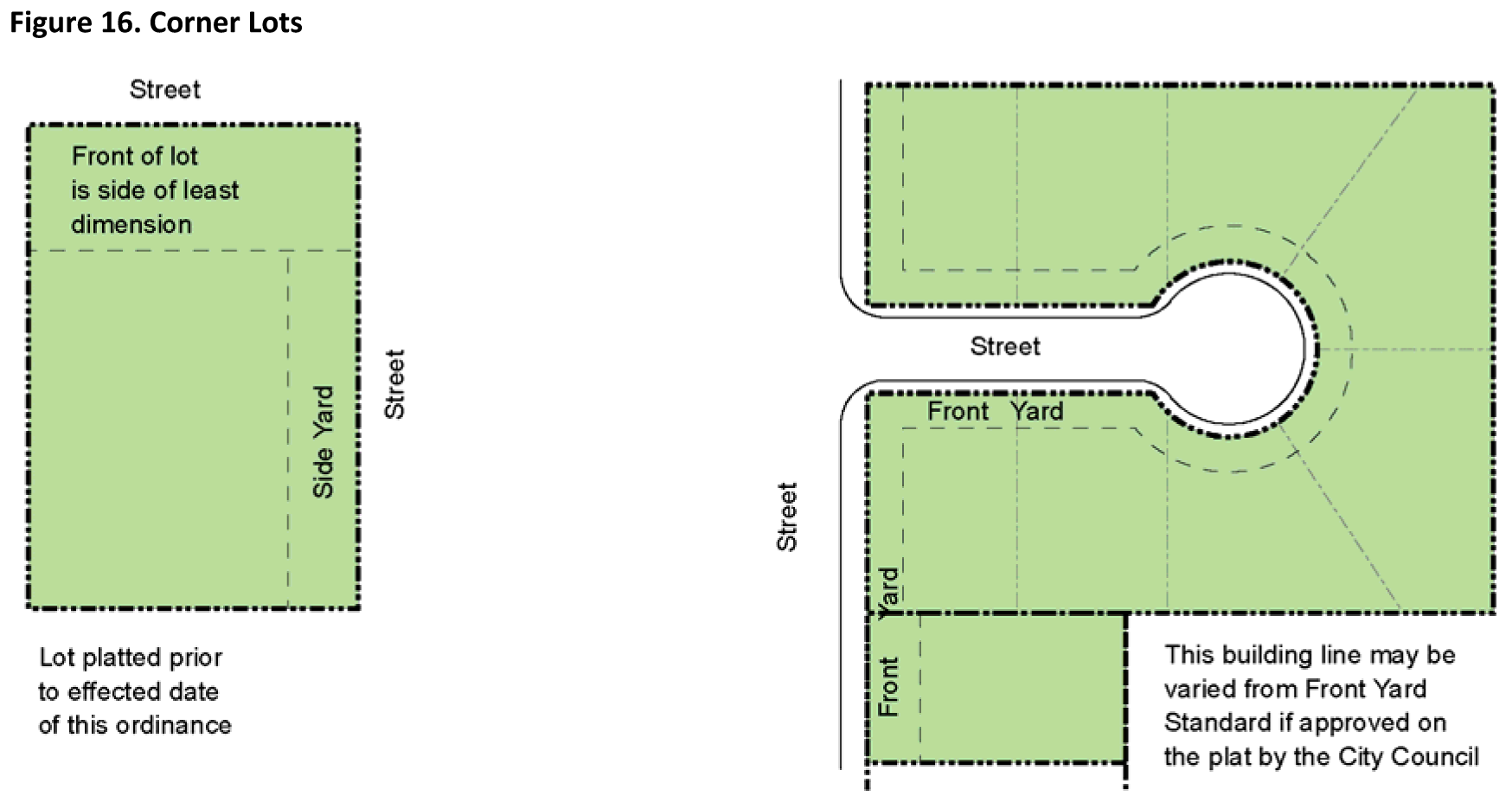 On a corner lot used for one-family or two-family dwellings, both street exposures shall be treated as front yards on all lots platted after the effective date of this Ordinance, provided however that where one (1) street exposure is designated as a side yard by a building line shown on a plat approved by the City containing a side yard of ten (10) feet or more, the building line provisions on the plat shall control. On corner lots, the lot width of least dimension shall be considered the front yard (Figure 16. Corner Lots).