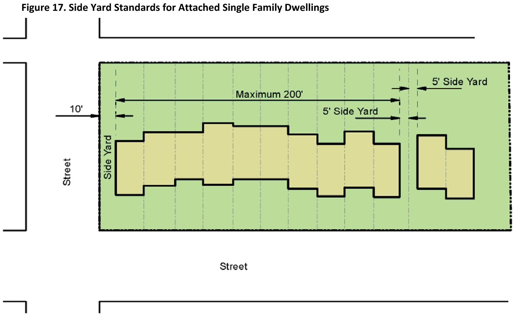 A one-family attached dwelling shall provide a minimum required side yard adjacent to a side street of ten (10) feet and no complex of attached one-family dwellings shall exceed two hundred (200) feet in length. A minimum required side yard of five (5) feet shall be provided at the end of each one-family attached dwelling complex so that the end of any two (2) adjacent building complexes shall be at least ten (10) feet apart (Figure 17. Side Yard Standards for Attached Single Family Dwellings).