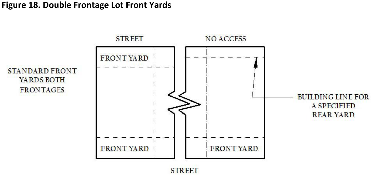 Double Frontage Yard Requirements. Where lots have double frontage, running through from one (1) street to another, a required front yard shall be provided on both streets unless a building line for accessory buildings has been established along one (1) frontage, in which event only one (1) required front yard need be observed (Figure 18. Double Frontage Lot Front Yards).