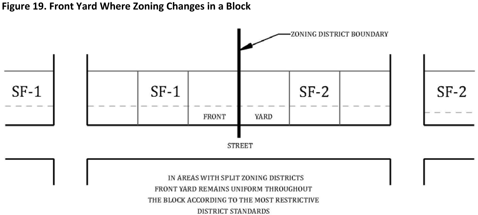Adjoining District Yard Requirements. Where the frontage on one (2) side of a street between two (2) intersecting streets is divided by two (2) or more Zoning Districts, the front yard shall comply with the requirements of the most restrictive District for the entire frontage (Figure 19. Front Yard Where Zoning Changes in a Block).