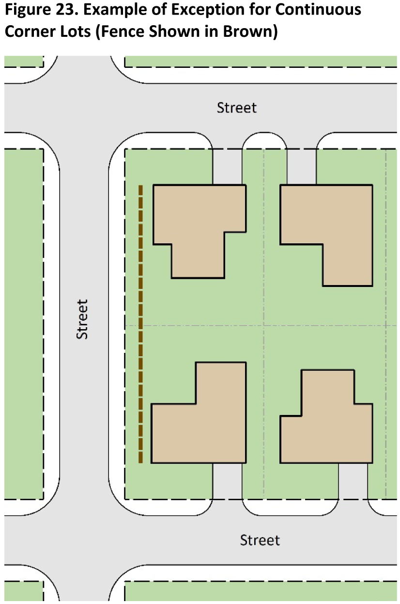 Except as provided herein, no fence or wall shall be permitted within the front yard facing a public street to which a residential lot is addressed, of any single-family residential lot that is adjacent to a public street, except on lots with multiple street frontages in which a side yard has not been established by a plat. In such instances, no fence or wall greater than six feet (6') shall be permitted within the front yard facing a public street to which a residential lot is addressed, of any single-family residential lot that is adjacent to a public street. A residential fence within the front yard of any single-family residential lot with multiple street frontages shall be set back at least ten feet (10') from the street or alley or five feet (5') from the sidewalk, whichever is greater. Notwithstanding the foregoing, in cases where the side or rear building line of the yards on continuous corner lots adjoin, the fence may be constructed out to the property line of the side yard such that the street side yard may be included as part of the lot's back yard area. See Figure 23 for an example of continuous corner lots. No fence shall be placed in any right-of-way, easement, fire lane, required parking space, or obstruct any visibility sight lines or triangles.