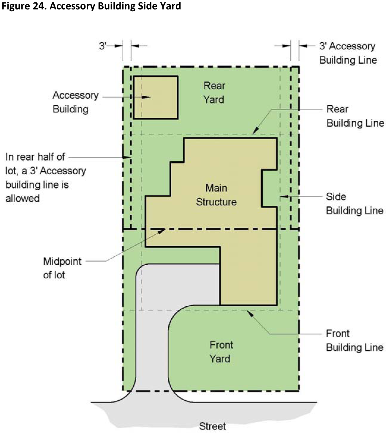 Side Yard. There shall be a side yard for any detached accessory building of not less than three (3) feet from any side lot line when such detached accessory building is located in the rear of the lot (the rear of a line erected connecting the midpoints on the two (2) opposite side lot lines of any lot, tract or plot). When a detached accessory building is located in front of the line connecting the two (2) midpoints of the opposite side lot lines as herein described, such accessory building shall observe the same side yard as specified for the main building (Figure 24. Accessory Building Side Yard).