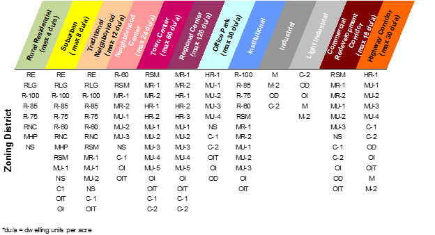 The character area categories established in the adopted comprehensive plan and shown on the future development map are to be implemented by approving rezonings to zoning districts listed within the following categories in Table 1.2, except the Scenic Corridor character area in which any zoning district may be approved. The zoning districts that are permitted within each character area shall be restricted as provided by Table 1.2.