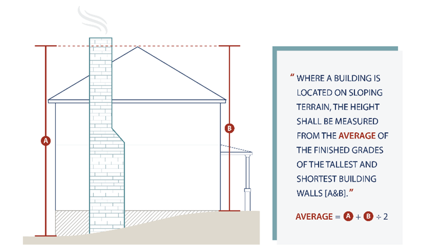 "Building height" means the vertical distance, measured from the average elevation of the finished grade at the front of the building to the highest point of the roof for flat roofs; to the deck lines of mansard roofs; and to the peak of the roof for gable, hip and gambrel roofs. Where a building is located on sloping terrain, the height shall be measured from the average of the finished grades of the tallest and shortest building walls.