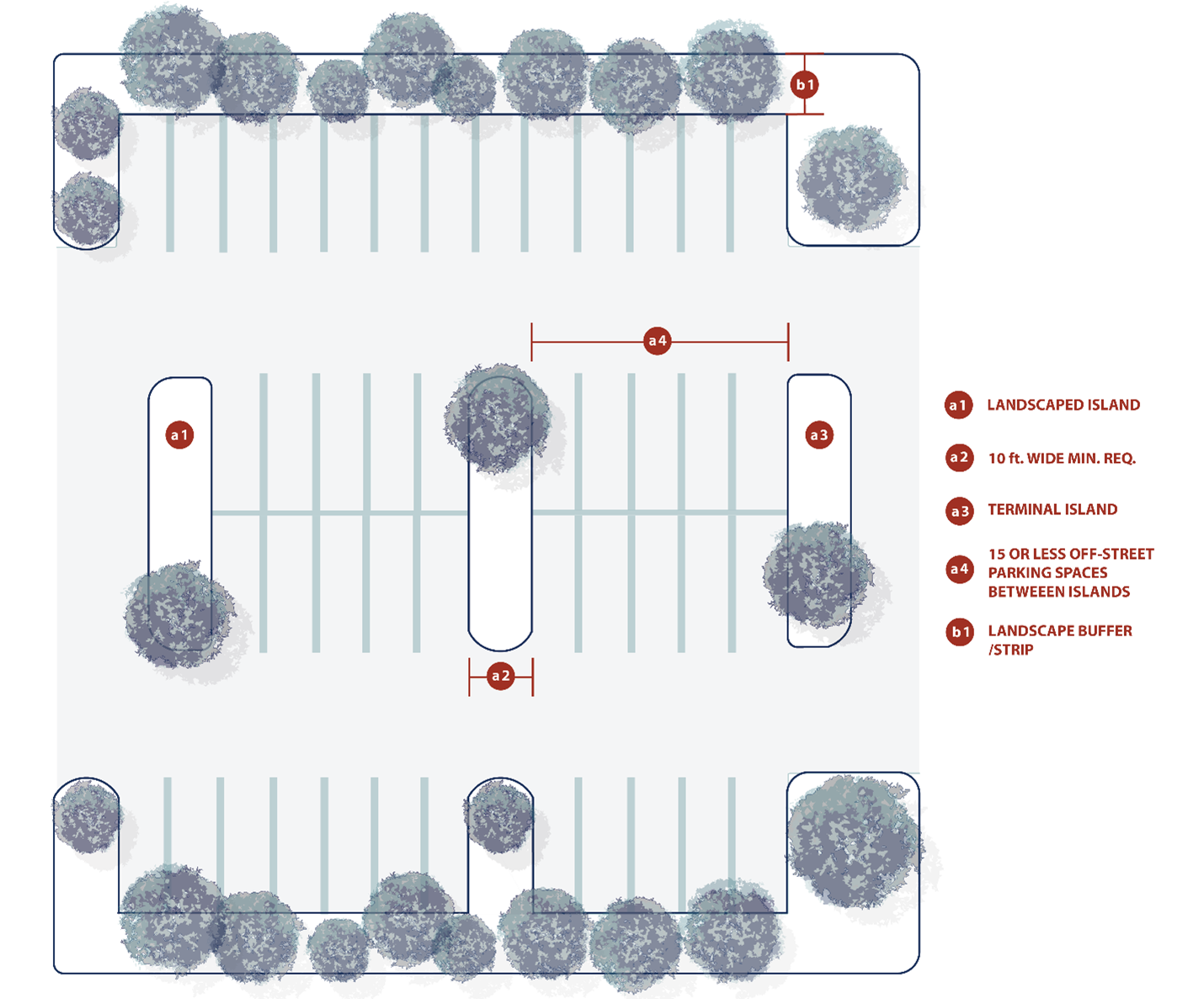 To soften the appearance of building masses and paved areas and reduce generation of heat and storm water run-off.
