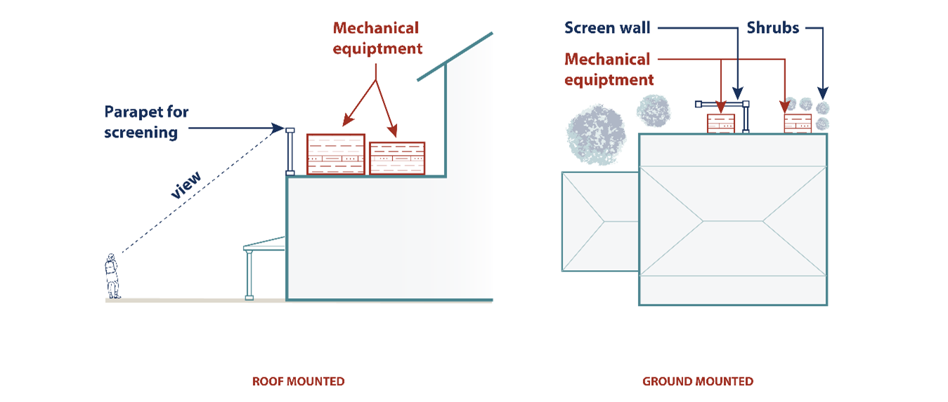Roof and ground mounted equipment including HVAC systems, service ladders and the like shall be appropriately screened by physical barriers consistent with building design and/or landscaping.