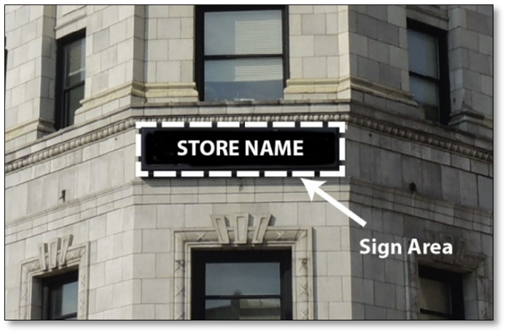 Samples or photos of colors and materials to be used for signs and the relationship to the building materials; and