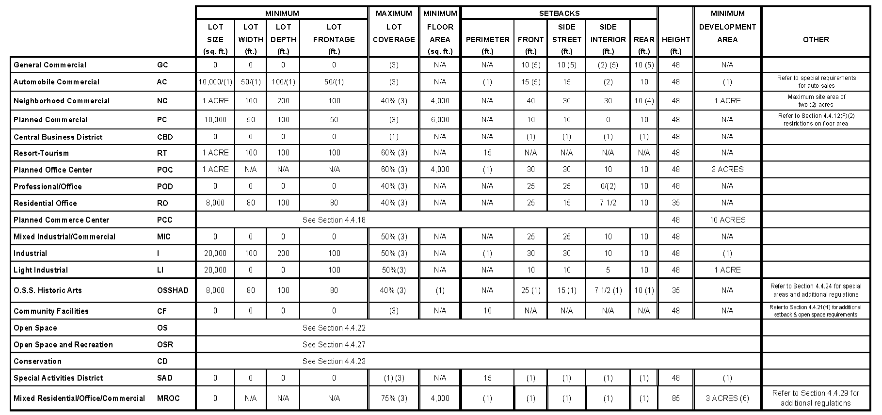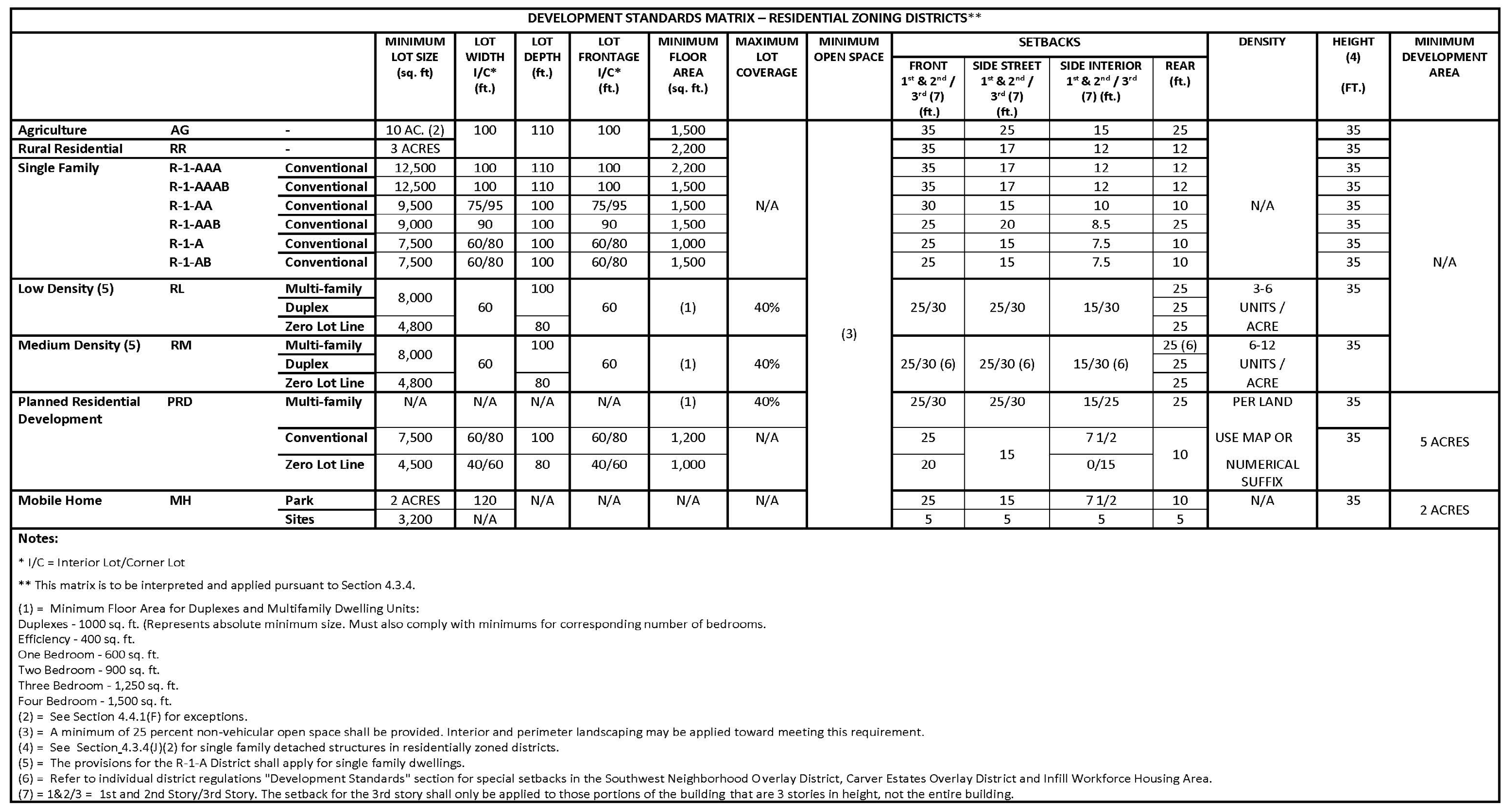 Development standards matrix. The following matrices set forth the minimum and maximum development standards for each zoning district subject to descriptions, interpretations, and exceptions as provided for elsewhere in Section 4.3.4.