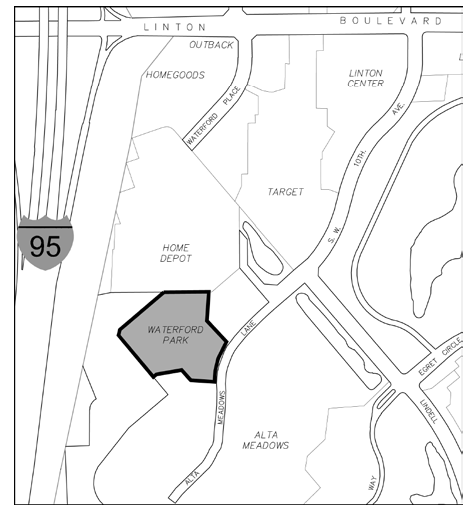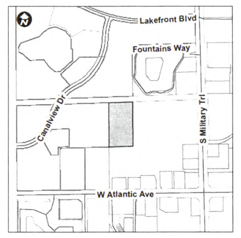 The North half (N ½) of the Northeast quarter (NE ¼) of Section 26, Township 46 South, Range 42 East, lying South of the Linton Boulevard road right-of-way, East of the LWDD E-3 Canal right-of way, and West of the Military Trail road right-of-way; together with Parcel 1, Delray Town Center, a Subdivision in Palm Beach County, Florida as per the Plat thereof recorded in Plat Book 65, Page 189, of the Public Records of Palm Beach County; together with Parcel A, Delray Outpatient Properties Plat, a Subdivision in Palm Beach County, Florida as per the Plat thereof recorded in Plat Book 99, Page 197, of the Public Records of Palm Beach County; together with the Northwest quarter (NW ¼) of the Northwest quarter (NW ¼), of Section 25, Township 46 South, Range 42 East, lying South of the Linton Boulevard road right-of-way, and East of the Military Trail road right-of-way, less the South half (S ½) of the Southeast quarter (SE ¼) of the Northwest Quarter (NW ¼) of the Northwest Quarter (NW ¼).