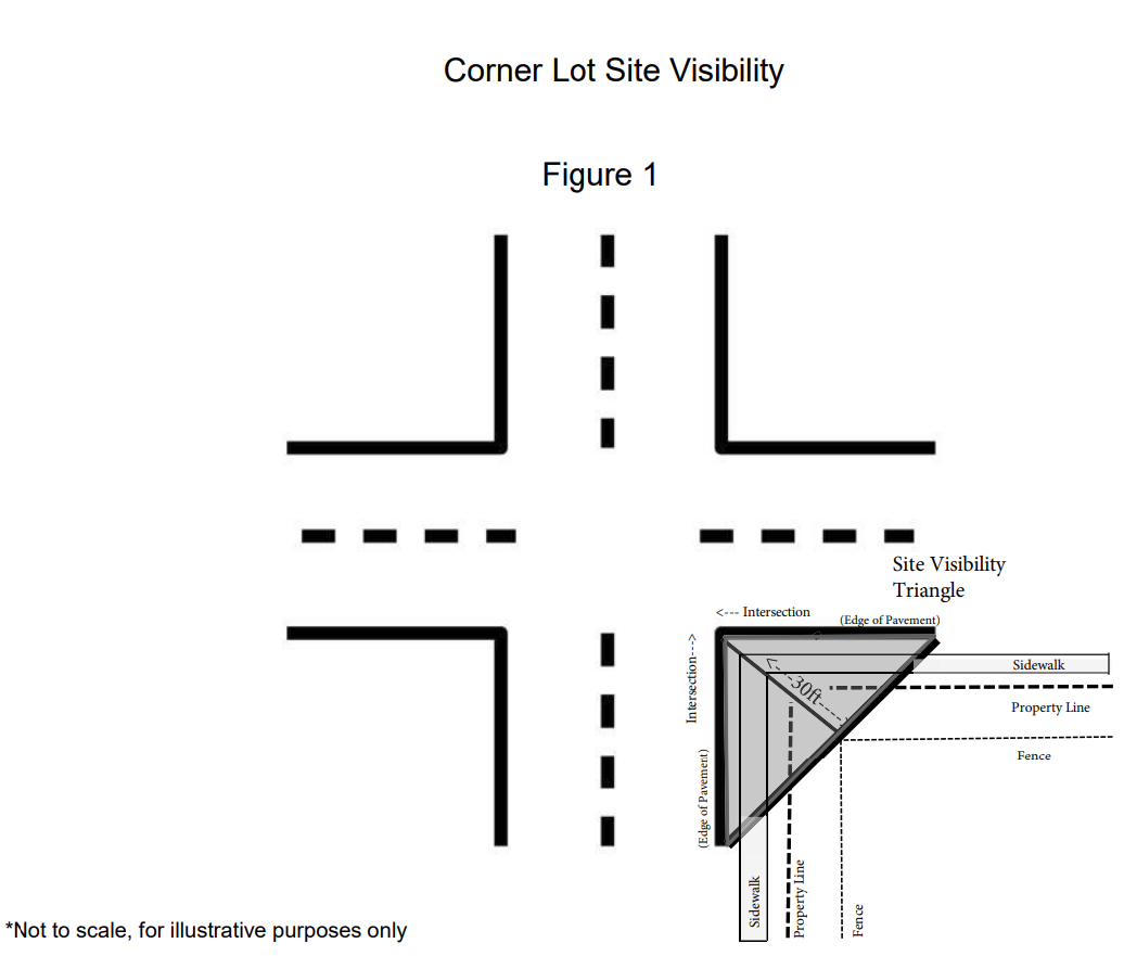 Corner lot sight visibility triangle. Any fence or hedge installed within the front yard and side street yard shall be reviewed for compliance with the following sight visibility triangle requirements. Fences shall not be permitted less than 30 feet from the edge of pavement of the intersection to ensure sight visibility is provided for safe vehicular movement and pedestrian crossing.
