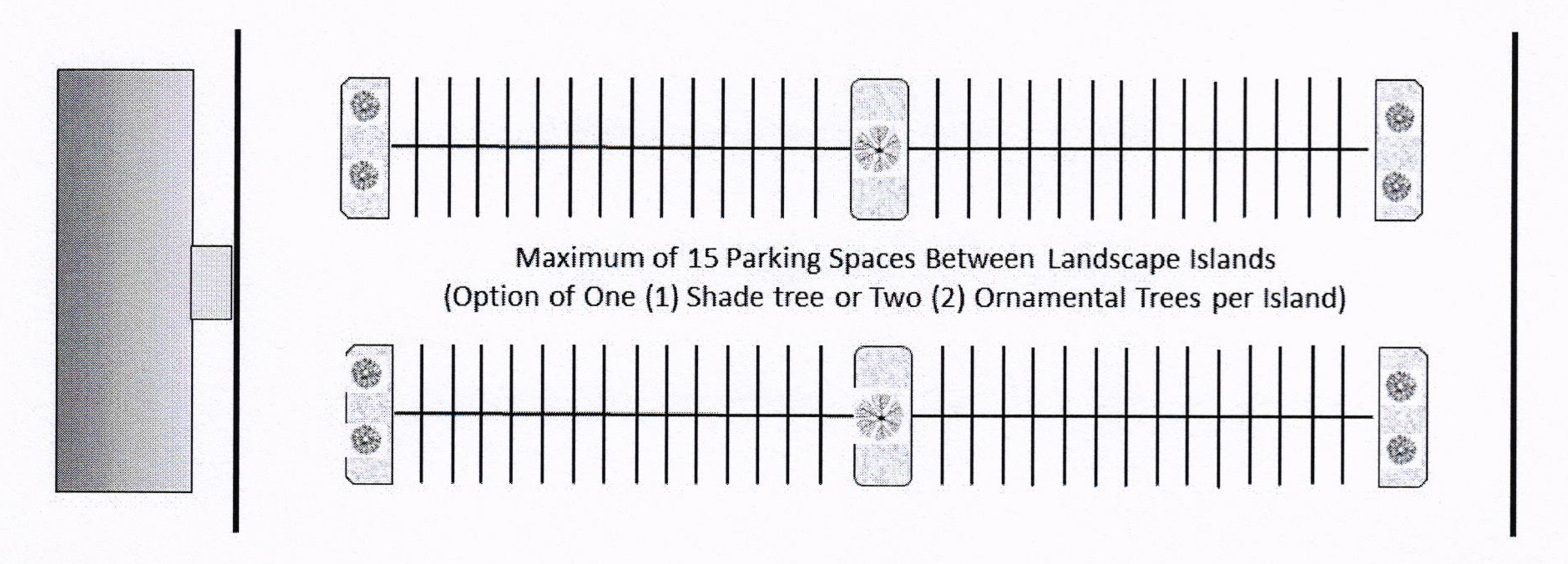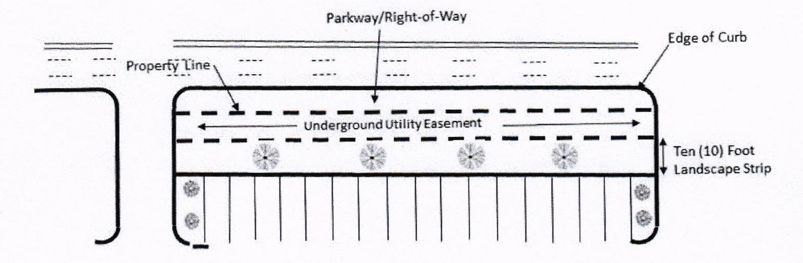 All parking and loading spaces, and vehicle sales areas on private property shall have a vehicle stopping device (e.g., curb, wheel stop, etc.) installed so as to prevent parking of motor vehicles in any required landscaped areas, to prevent vehicles from hitting buildings, to protect public and/or private utility structures/facilities, and to prevent parked vehicles from overhanging a public right-of-way line, public sidewalk, or adjacent private property (see Illustration 3). An extra-wide walkway on private property may be permitted so as to allow encroachment of vehicle overhang while maintaining an unobstructed four-foot minimum walkway width. The requirement shall apply only where spaces are adjacent to the walks, right-of-way, and required landscaping. Parking shall not be permitted to encroach upon the public right-of-way in any case. For new construction only, all vehicle maneuvering shall take place on-site. No public right-of-way shall be used for backing or maneuvering into or from a parking space, or for circulation within the parking lot.