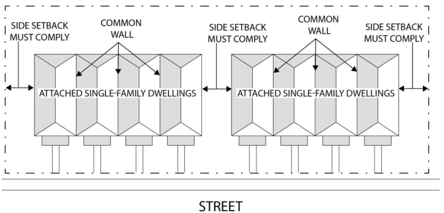 Attached single-family dwellings sharing a common wall are not required to comply with side setback requirements, except for the outside walls of the end units.