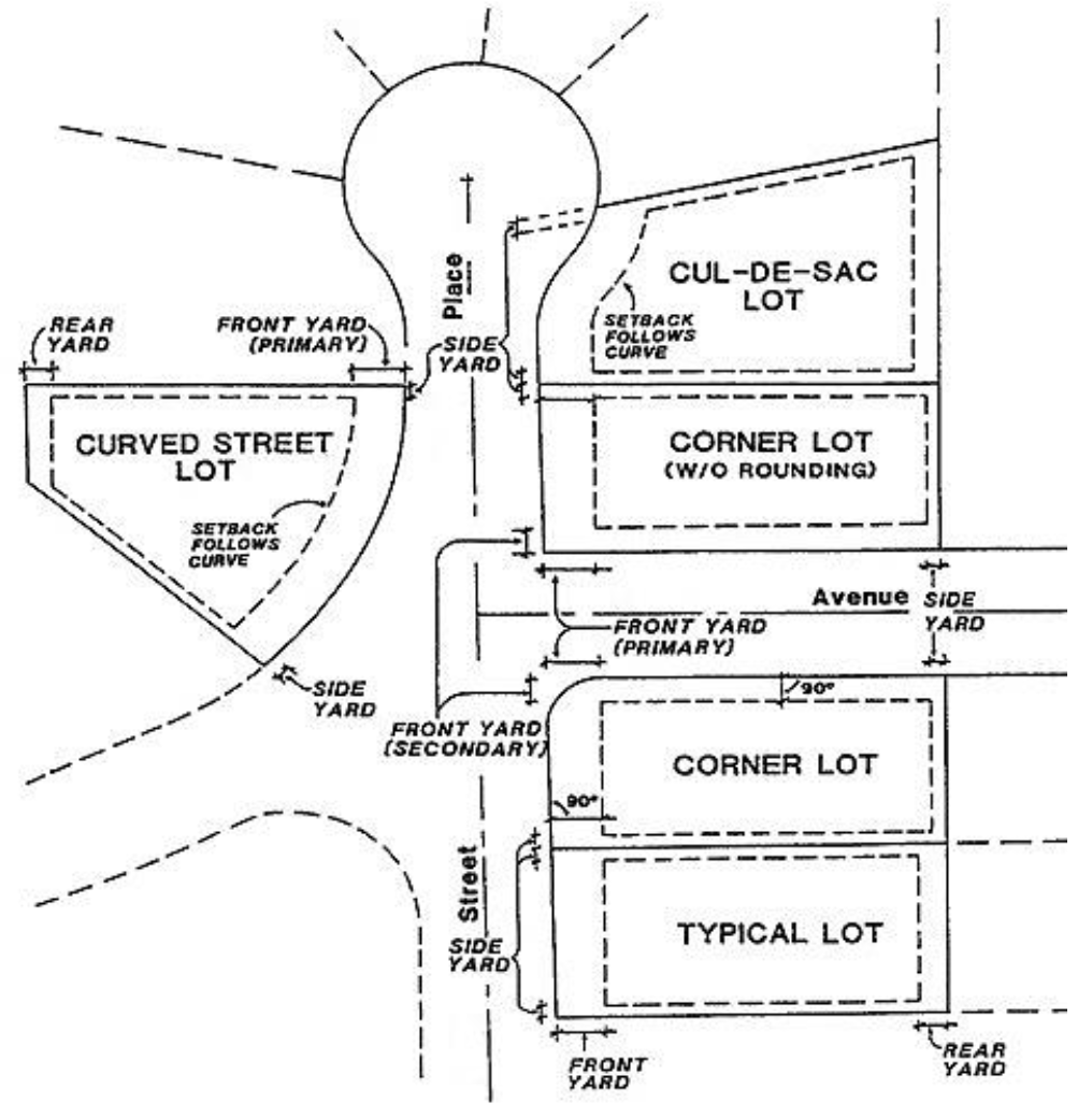 Yard, setback, and open space regulations as referenced elsewhere in this Title shall be subject to interpretation based on the defined areas as shown in Figure 406.010-A as shown below and shall be subject to the provisions as follow Figure 406.010-A: