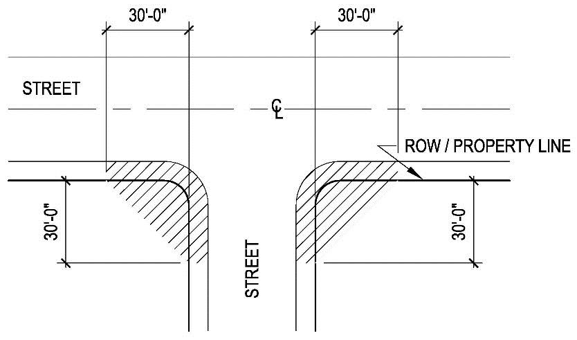 On any corner lot within any zoning district within the City, a sight triangle area as depicted in Figure 406.010-B below is required to be provided to allow for safe vehicular, pedestrian, and bicyclist vision of approaching traffic. This area shall be free of signs, fences, trees, shrubbery or other plant material (greater than 36 inches in height). The area depicted in Figure 406.010-B is intended to depict a general requirement. The actual dimensions of the site triangle, its orientation to the street right-of-way, and the types of plant material to be allowed shall be subject to review by the Director of Public Works who shall approve the specifically required sight triangle area based on the character of the streets at the intersection, the topography conditions of the lot, and other factors that may affect the safety of the intersection.