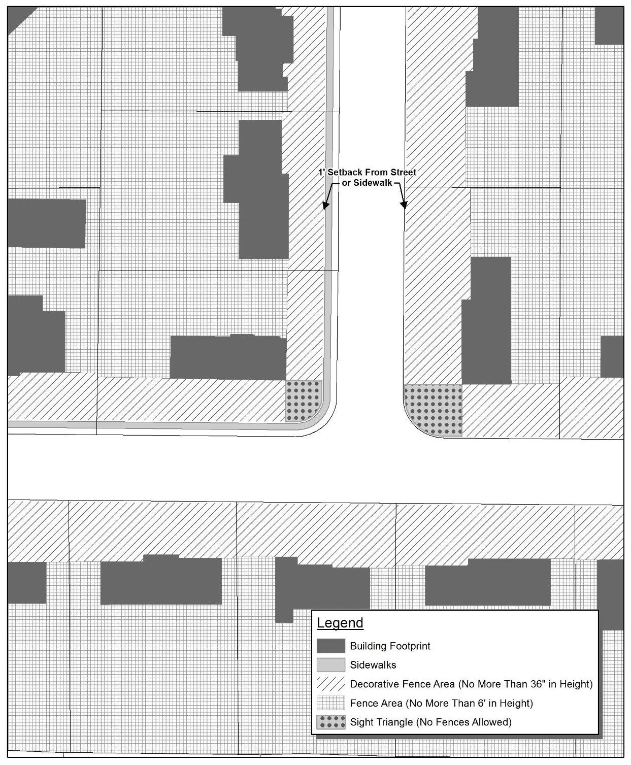 When a single-family dwelling on a corner lot faces a minor street and has a second front yard adjacent to a major collector or arterial road, a decorative or privacy fence, up to six (6') feet in height, shall be permitted in the second front yard. Such fences must be a minimum of one (1') foot inside the sidewalk and may not encroach on the sight triangle.