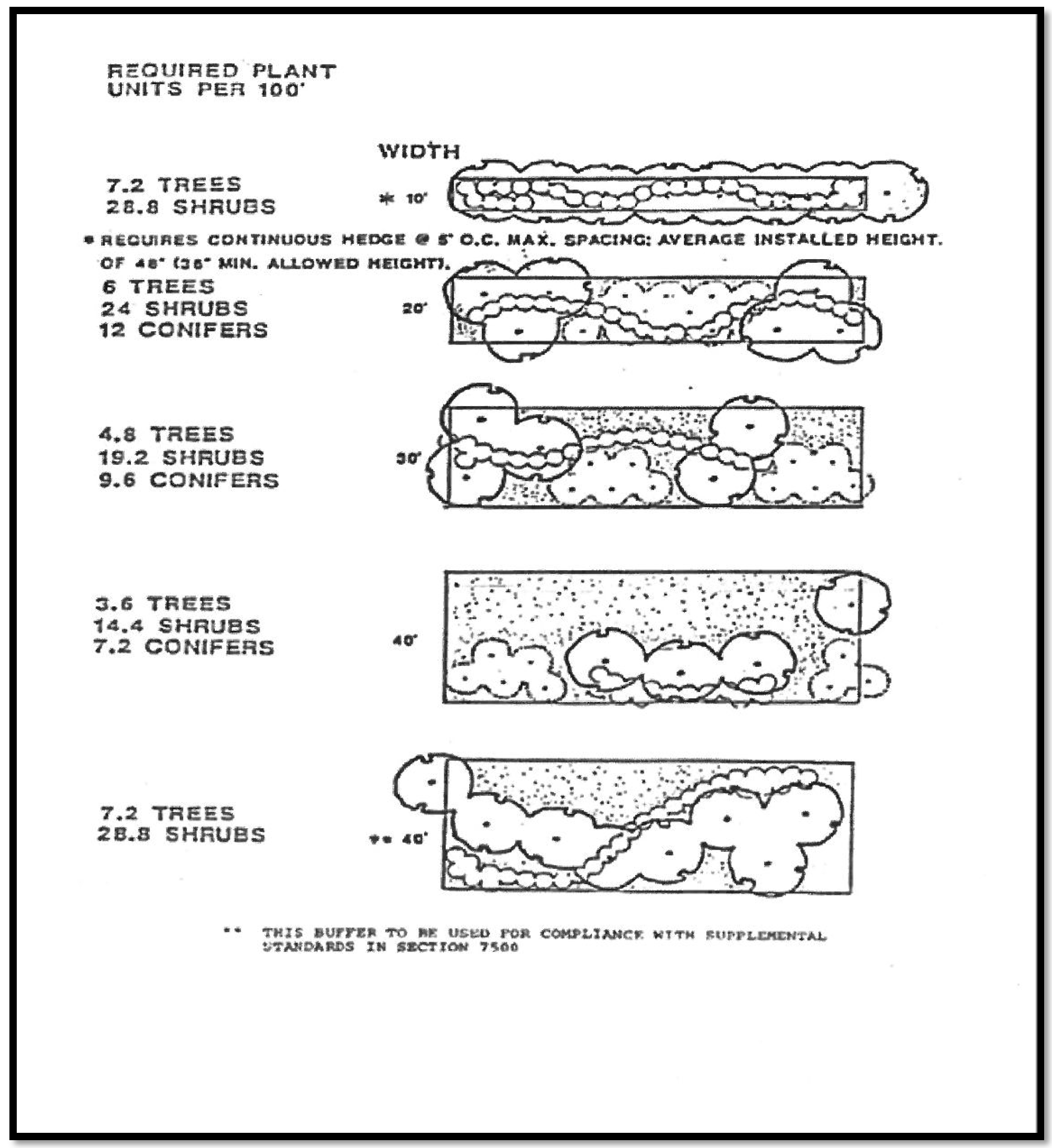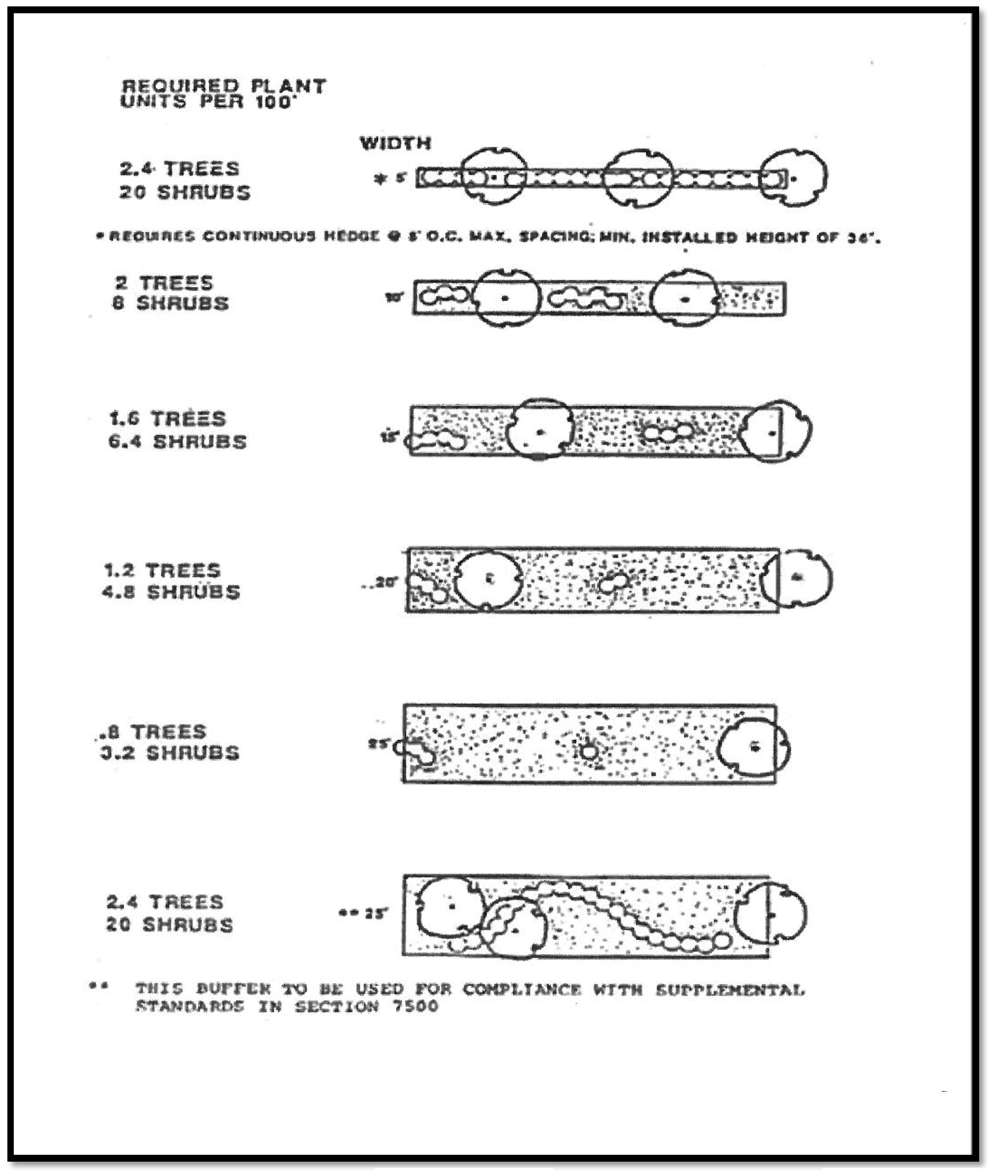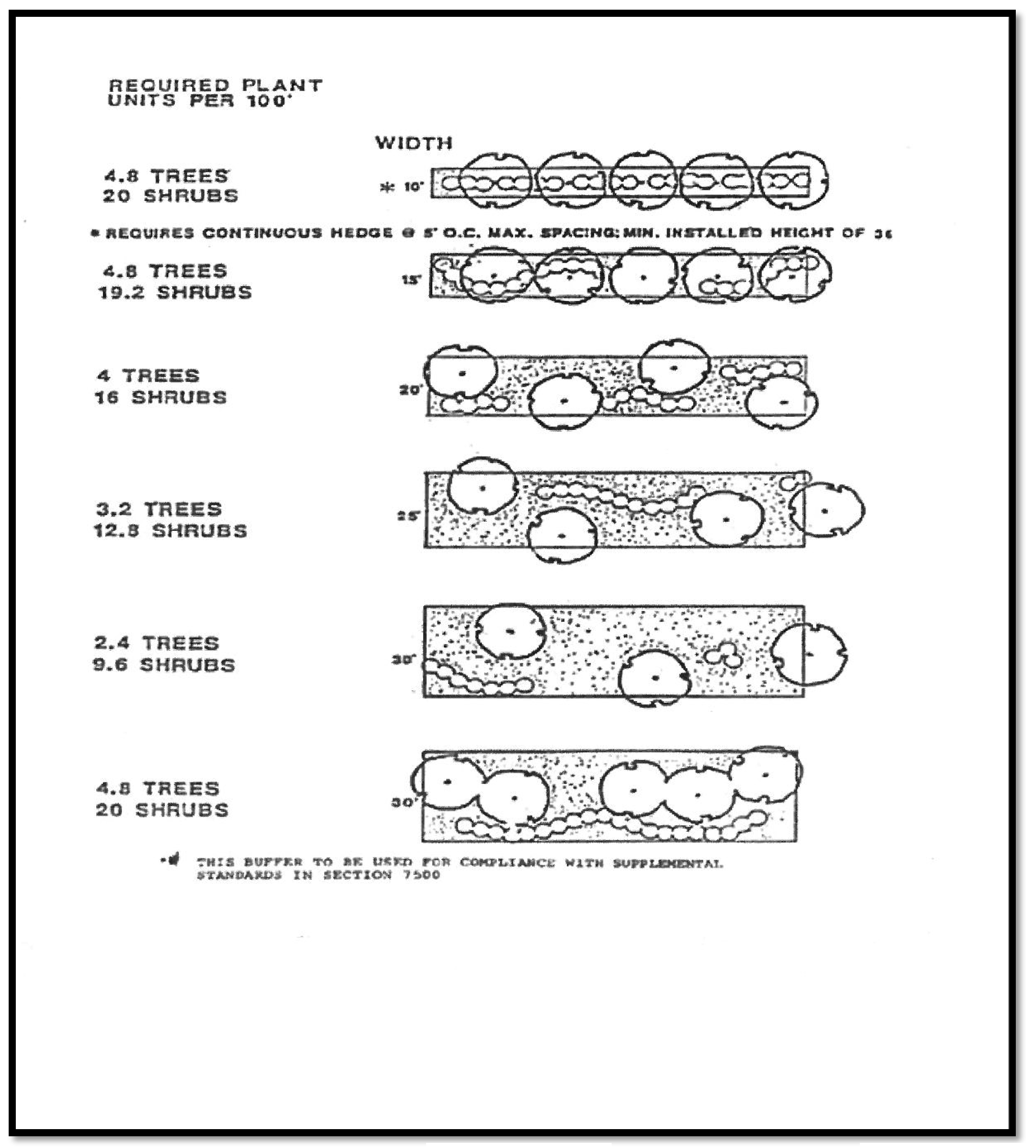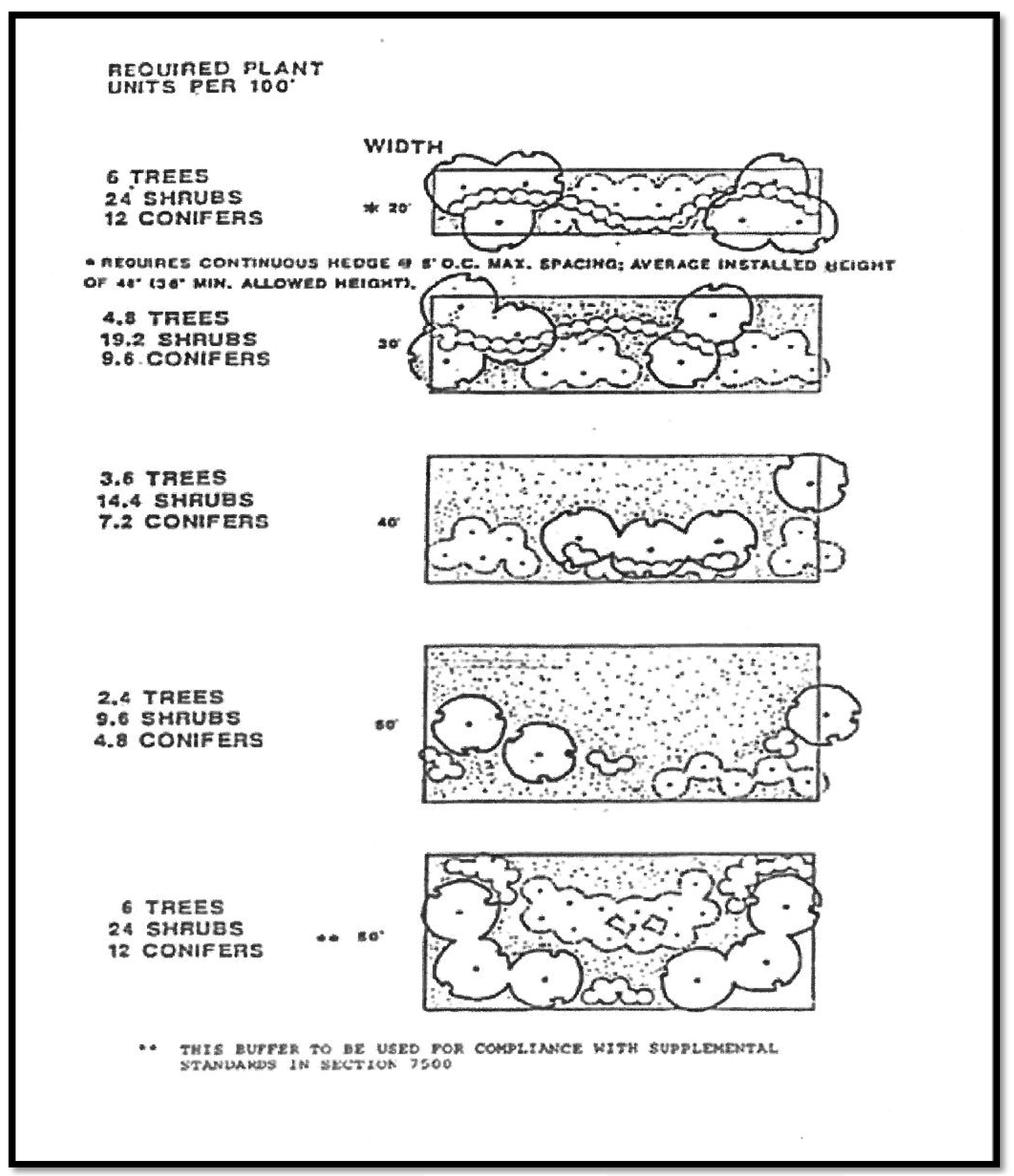 Refer to the Buffer Matrix for buffer requirements on each property boundary or portion thereof and select the desired buffer option for the specified type of buffer from those shown in Figures 7-4 through 7-7, which are set forth in Section 20-604.