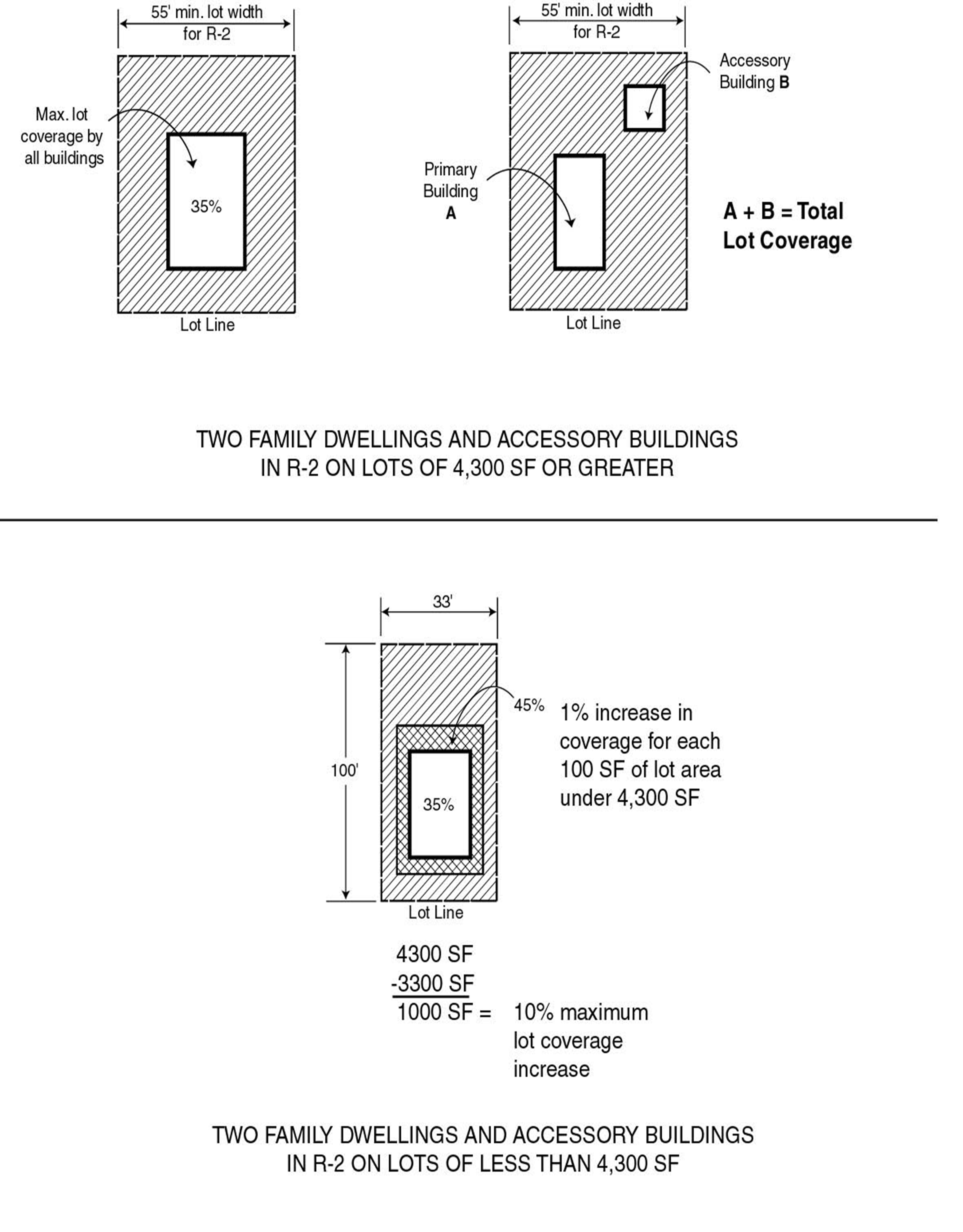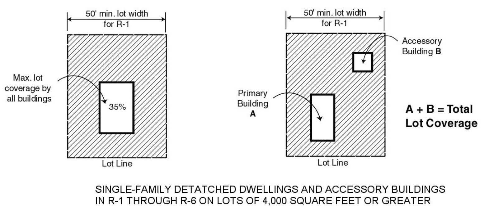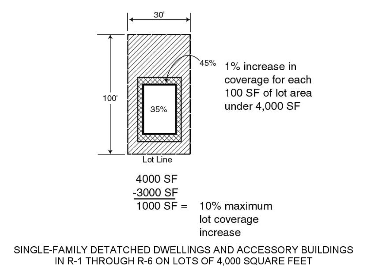 The combined area occupied by all buildings used as, or accessory to, single-family dwellings or religious residential facilities, shall not exceed 35 percent of the area of the zoning lot (see Figure 50-13-185(a)), provided, that on zoning lots of less than 4,000 square feet in area on land zoned R1, R2, R3, R4, R5, or R6, the allowable percentage of lot coverage may be increased by one percent for each 100 square feet where the area of the zoning lot is less than 4,000 square feet, with a maximum coverage that is not in excess of 45 percent (see Figure 50-13-185(b)); and