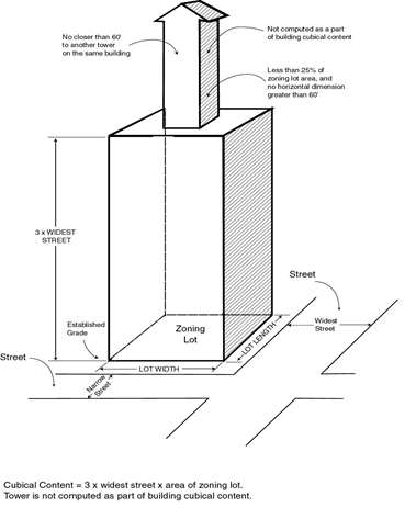No building or structure, or part thereof, shall be erected, altered, or enlarged to such a size or height that the cubical content of such building or structure above the grade plan shall exceed the volume of a block or prism having a height equal to three times the width of the widest street abutting the zoning lot upon which the building or structure is located or to be located, and a base equal to the area of the zoning lot, provided, that towers may be erected over and above the cubical content limit where: