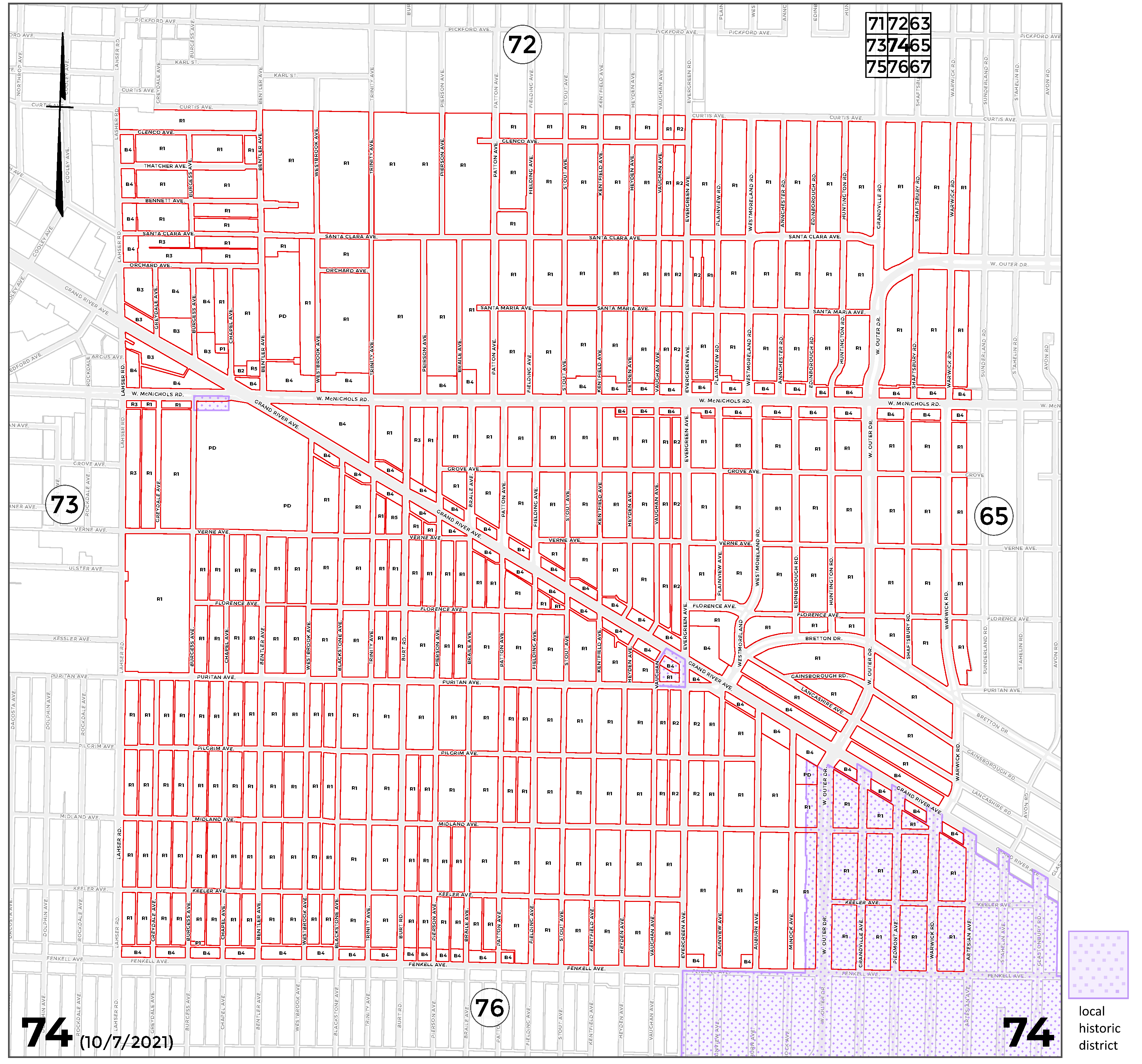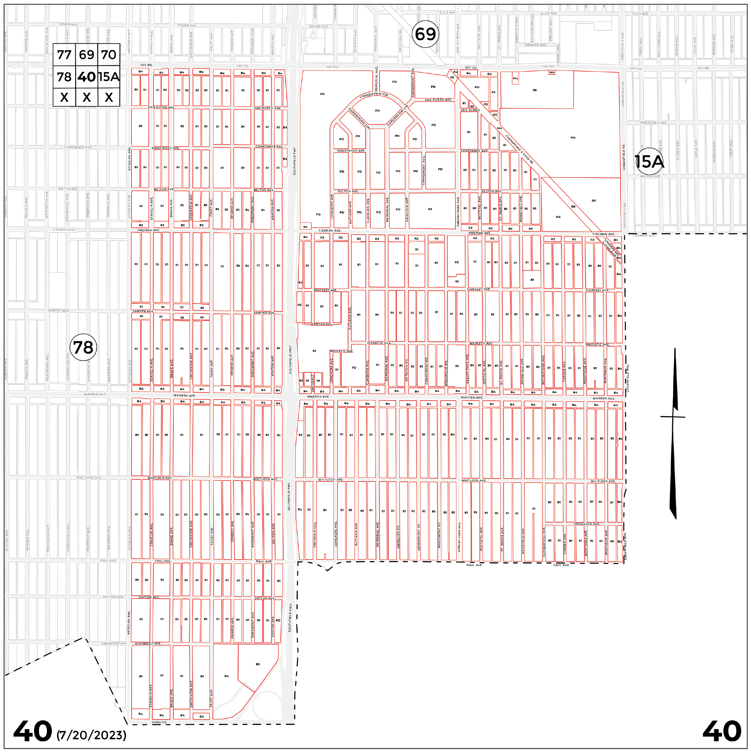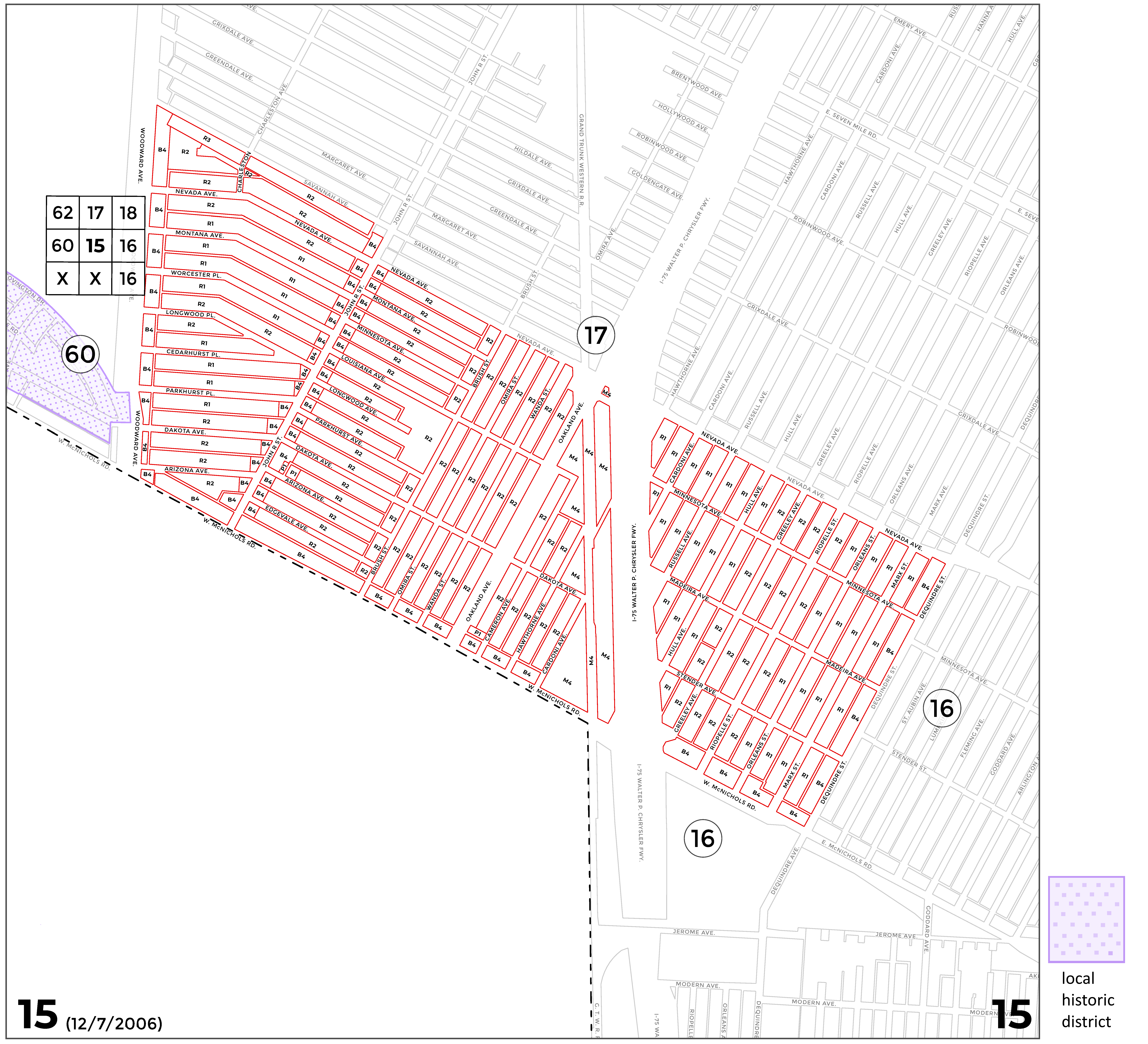In accordance with the Zoning Enabling Act of Michigan, Public Act 207 of 1921, as amended by Public Act 306 of 1941, on December 25, 1940, the City of Detroit enacted a zoning ordinance, which included 79 zoning district maps. This article contains Zoning District Maps Nos. 1 through 78, whose boundaries were established on, and remain unaltered since, December 25, 1940. Each map depicts current zoning classifications. The history notes, which follow each map, delineate the ordinances that established and amended each map.