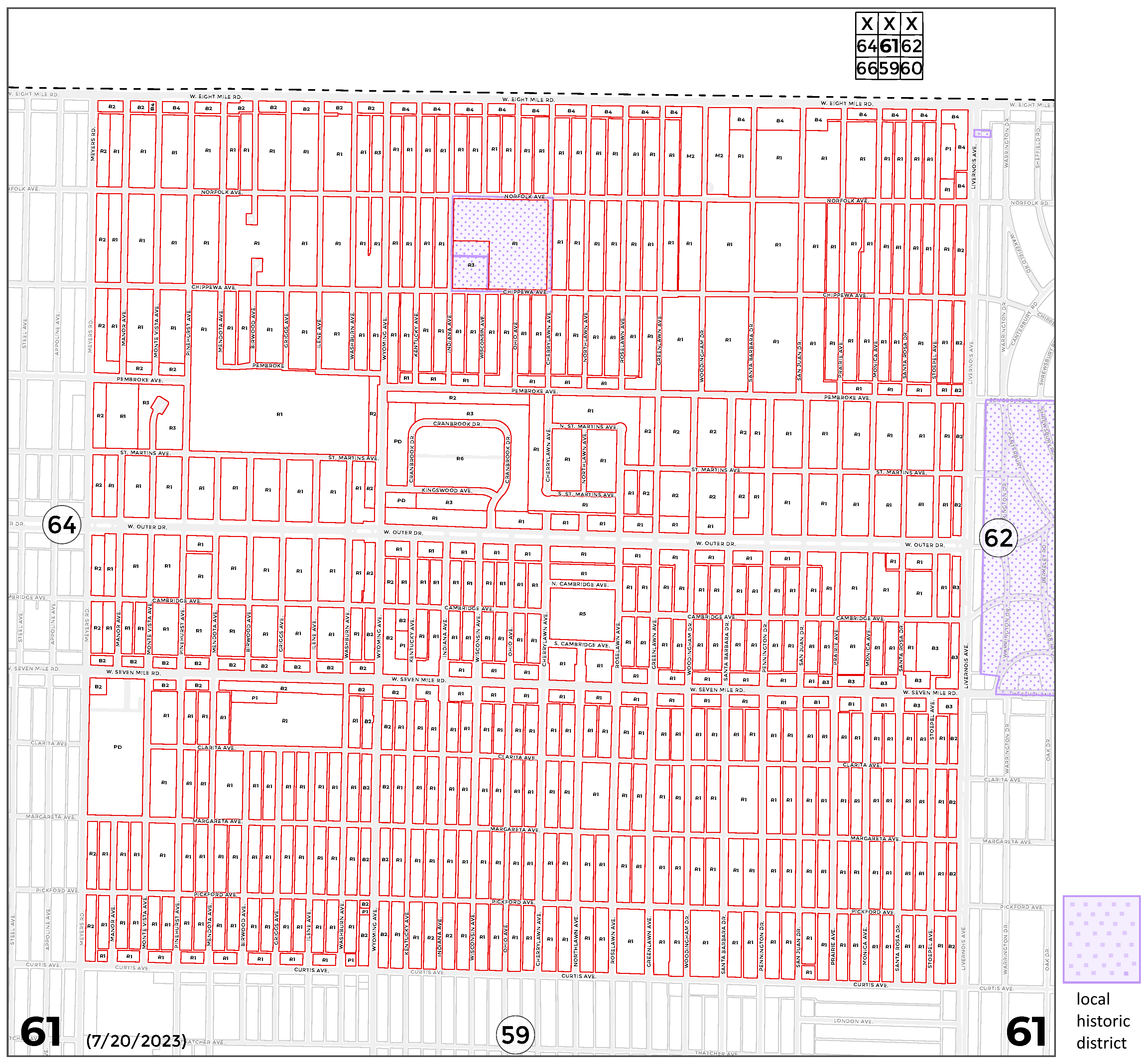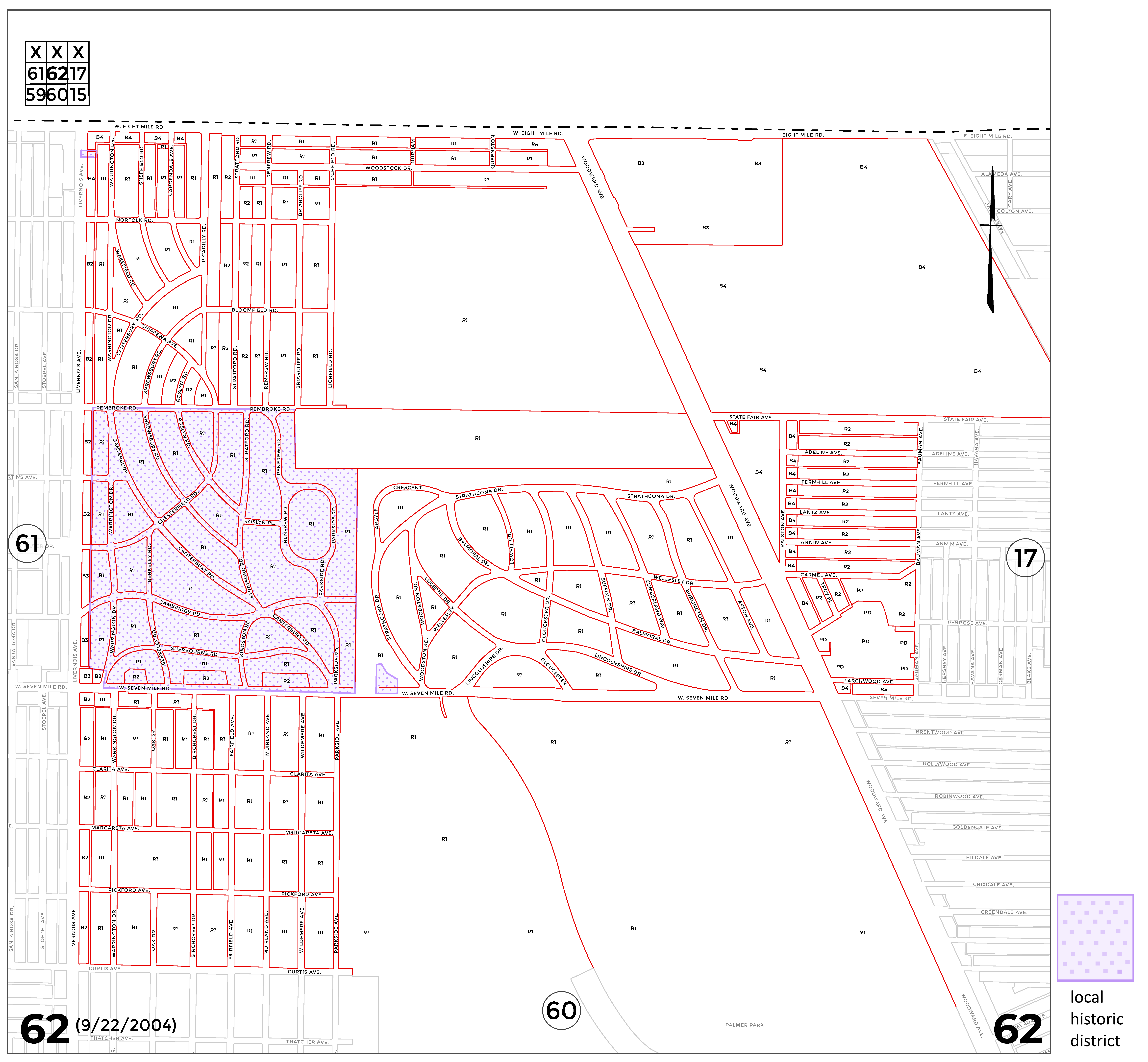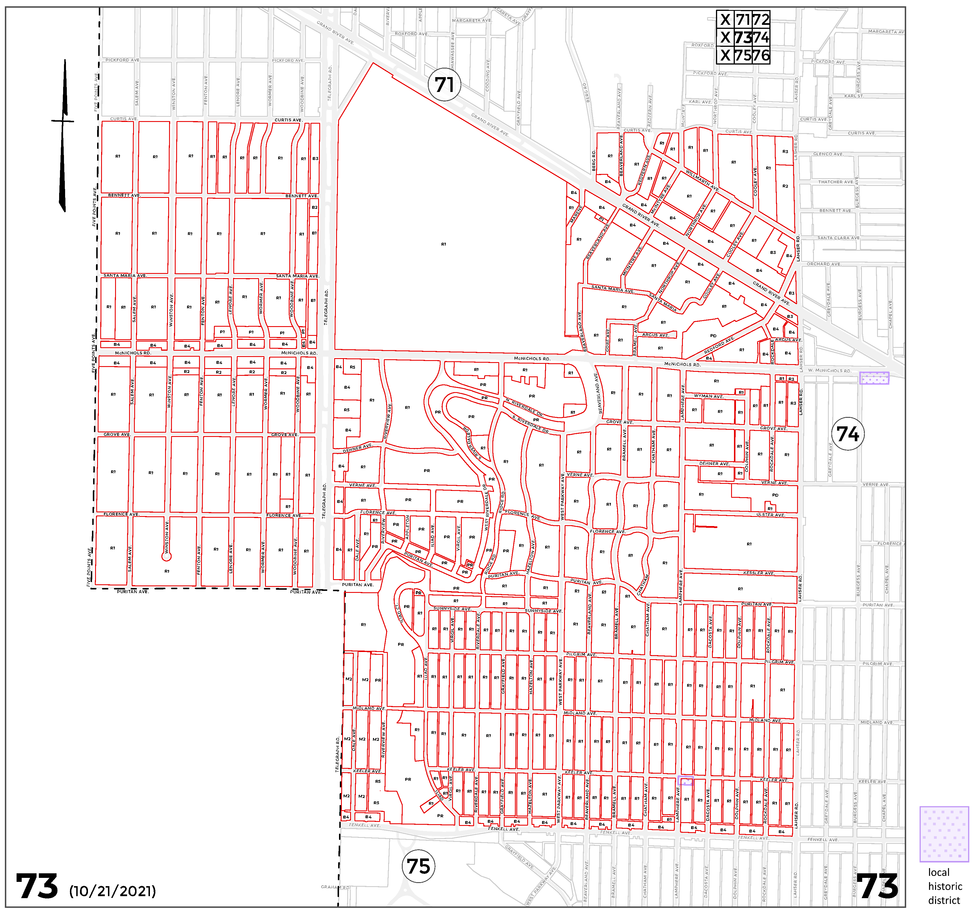 In accordance with the Zoning Enabling Act of Michigan, Public Act 207 of 1921, as amended by Public Act 306 of 1941, on December 25, 1940, the City of Detroit enacted a zoning ordinance, which included 79 zoning district maps. This article contains Zoning District Maps Nos. 1 through 78, whose boundaries were established on, and remain unaltered since, December 25, 1940. Each map depicts current zoning classifications. The history notes, which follow each map, delineate the ordinances that established and amended each map.