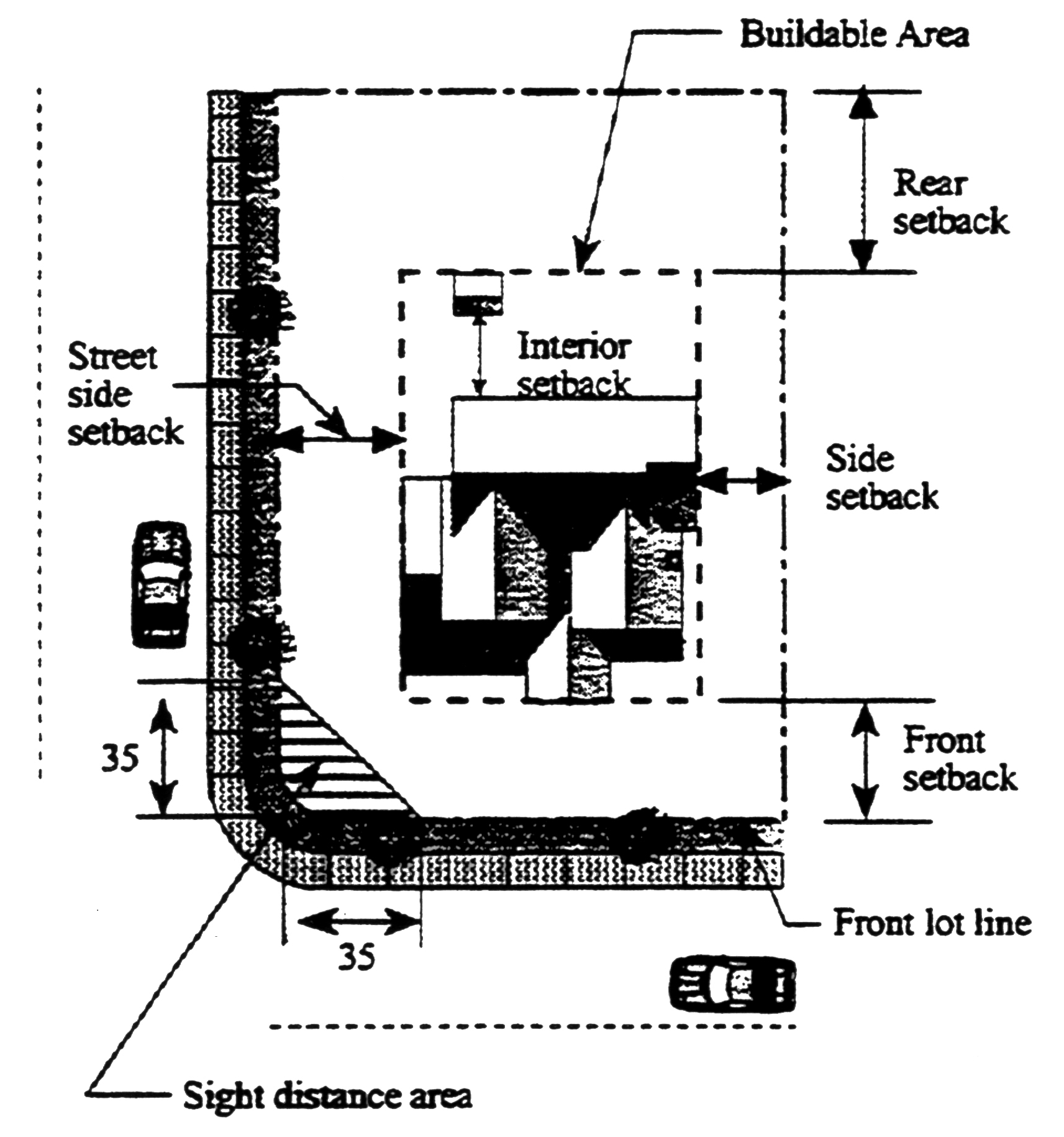 Traffic safety sight area. A triangular area on a corner parcel formed by measuring 35 feet from the intersection of the front and street side property lines, and connecting the lines across the property. See Figure 6-9.