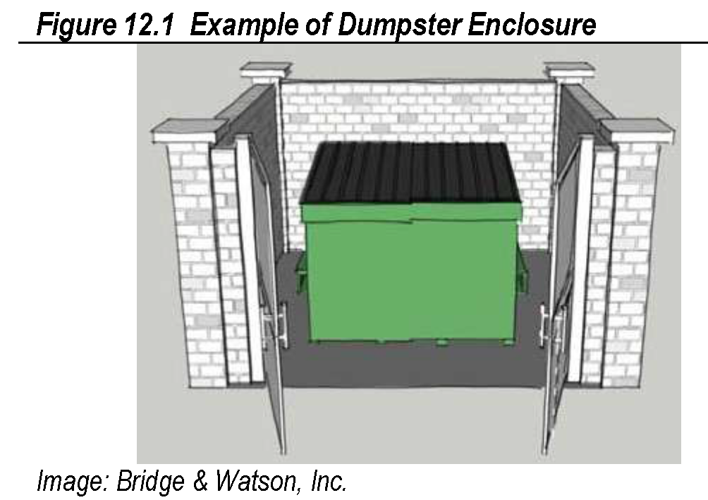 Dumpsters shall be located in the rear yard behind the building they serve, or otherwise in an inconspicuous location.