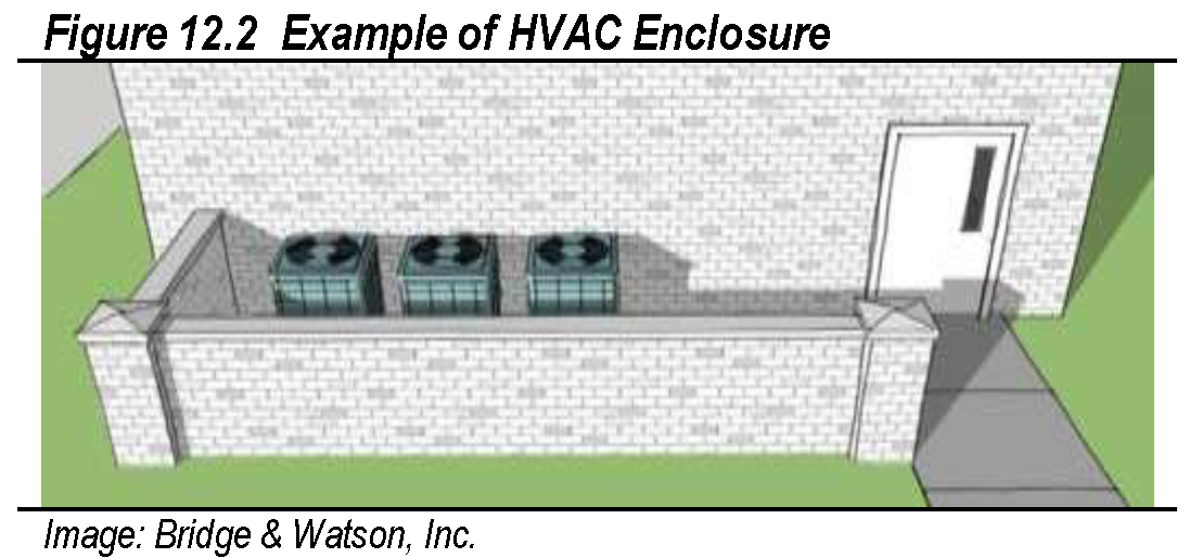 Screening of mechanical equipment, tanks, loading decks, refuse handling, ancillary equipment, etc., whether on the roof or on the site.