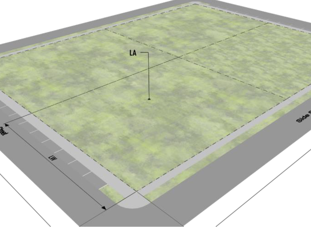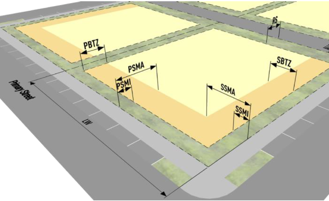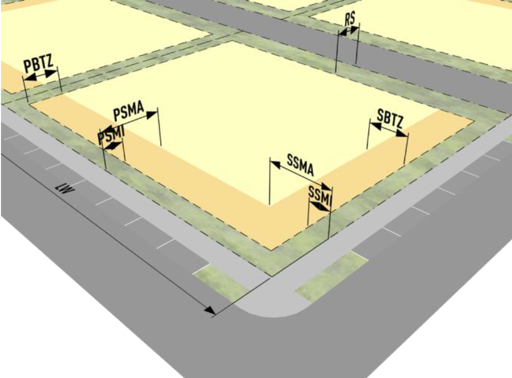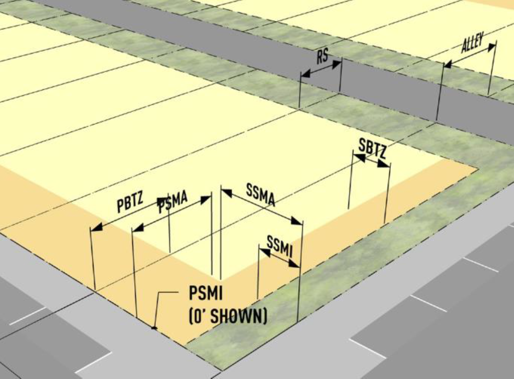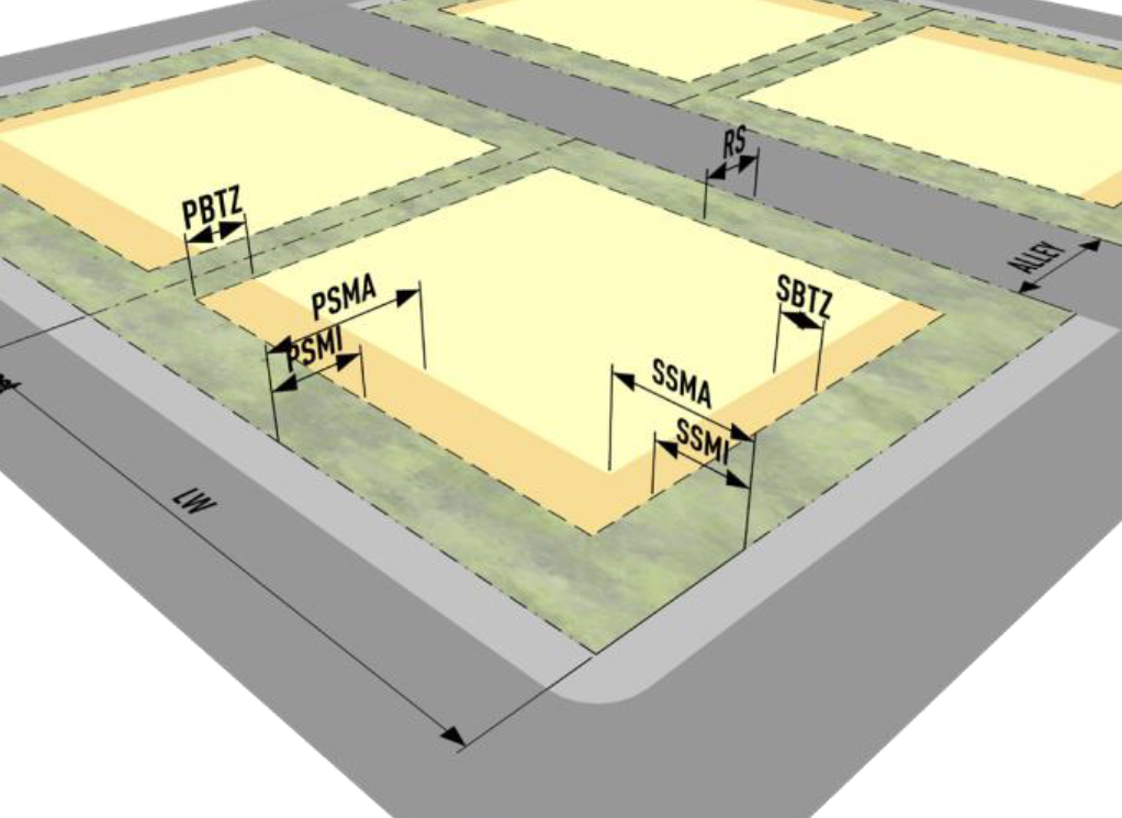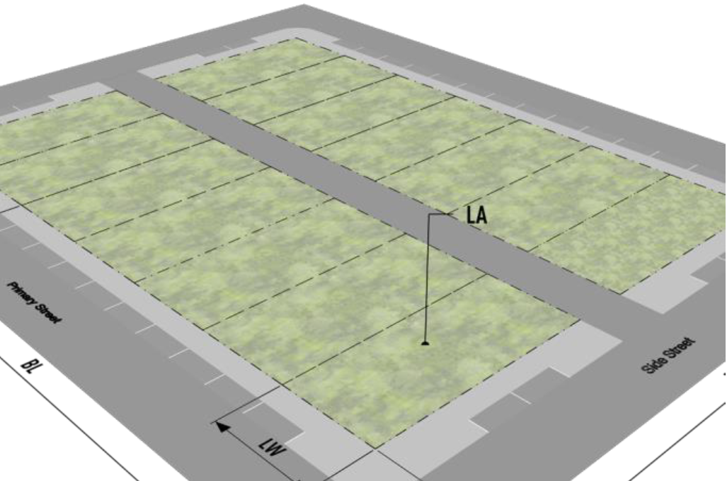 Lot width: Minimum of 80 feet at building setback line, and 40 feet on a public or platted street. Corner lots shall have a minimum width of 85 feet at the building setback line.
