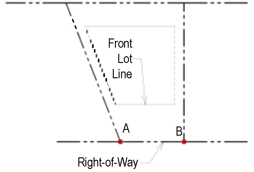 In the case of irregularly shaped lots, the minimum lot width specified in the district shall be measured at the front lot line of the minimum required front yard, provided that in no case shall the lot frontage measured at the street right-of-way line be less than seventy (70%) percent of the required minimum lot width except in the following situations: on cul-de-sacs or courts or street centerline curves of less than three hundred (300') feet radius where the lot frontage measured at the street right-of-way line shall not be less than forty (40%) of the minimum lot width.