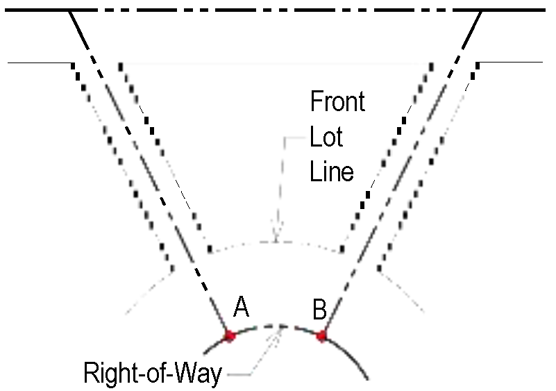 Such triangular area shall be bound by the intersecting driveway, access way, or street centerlines and a diagonal connecting two points as measured along the back of curb on both streets and driveways for a distance of twenty-five (25) feet from the point of intersection of the curb lines. In the absence of curb, the triangular area shall be measured twenty-five (25) feet from intersection of the projection line of the edge of pavement.