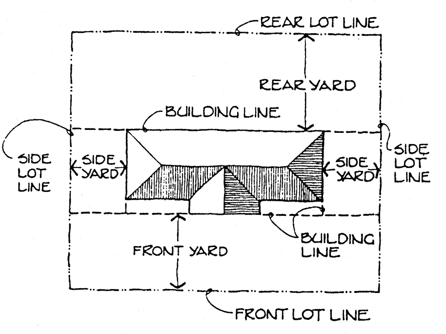 Setback refers to the required minimum horizontal distance between the building line and the front, side, corner, or rear property line. Required setback dimensions shall be measured from the property line to the outside wall of the structure, not to include normal eave projections of thirty (30) inches or less.