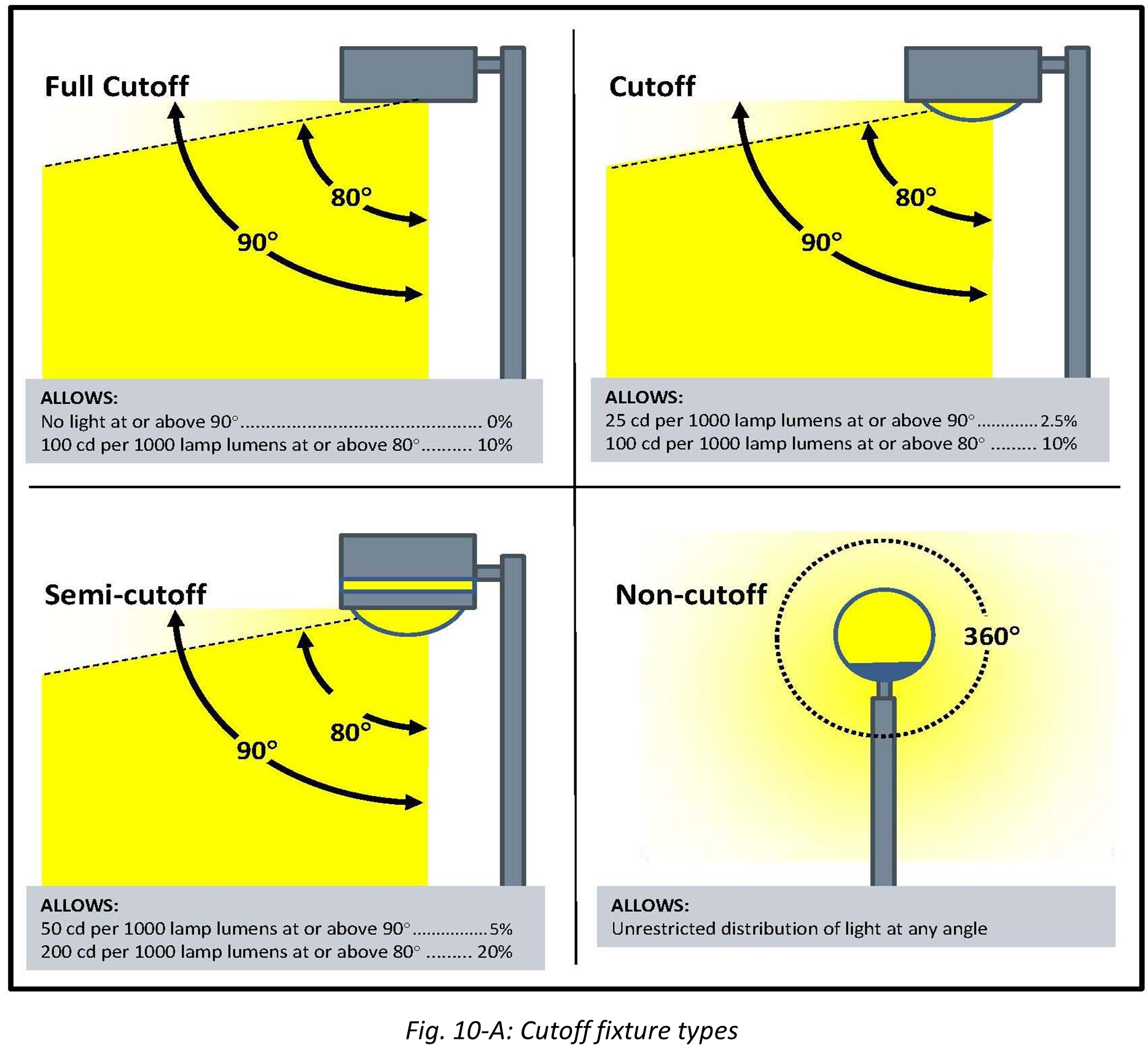 Fixtures illuminating parking and pedestrian areas, both freestanding and building mounted, shall have full cutoff fixtures as identified in Figure 10-A, Cutoff Fixture Types.