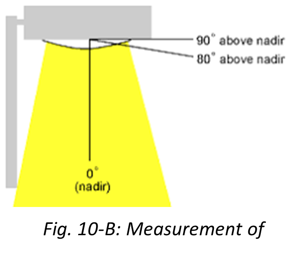 Building-mounted lighting shall be shielded and directed at a downward angle no higher than 45 degrees above the nadir (half-way between straight down and straight to the side) measured perpendicular from the pole or mounting wall. See Figure 10-B.