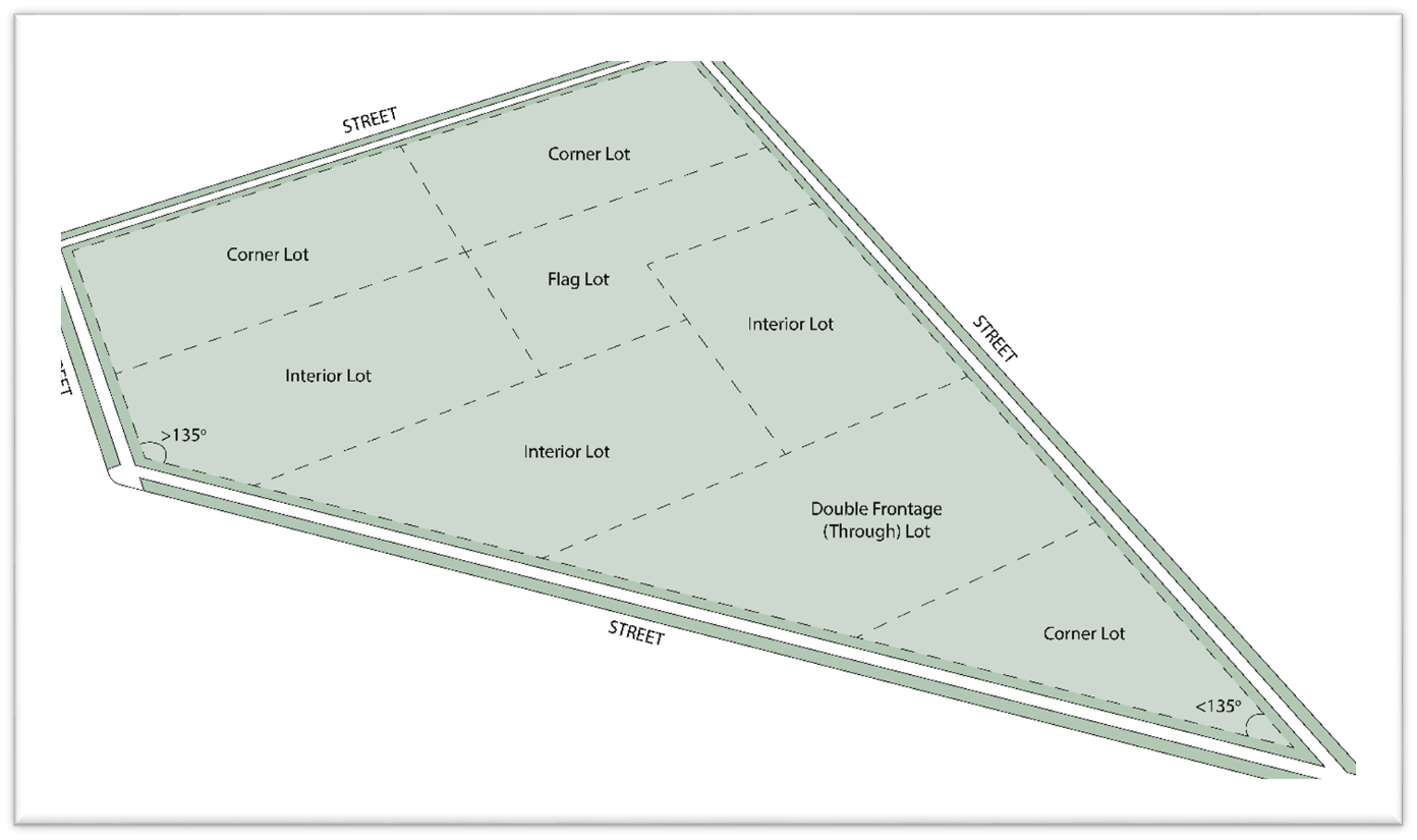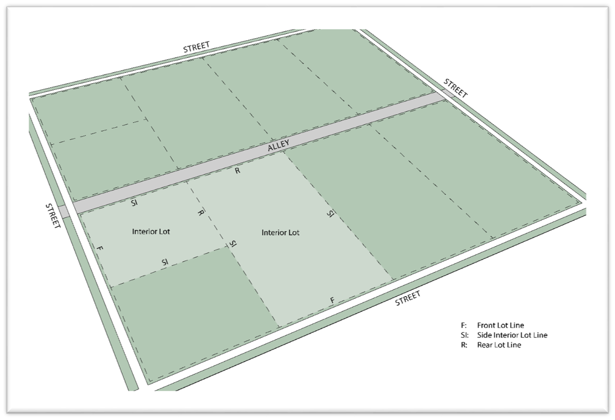 Interior Lot: A lot other than a corner lot with only one frontage on a street other than an alley.