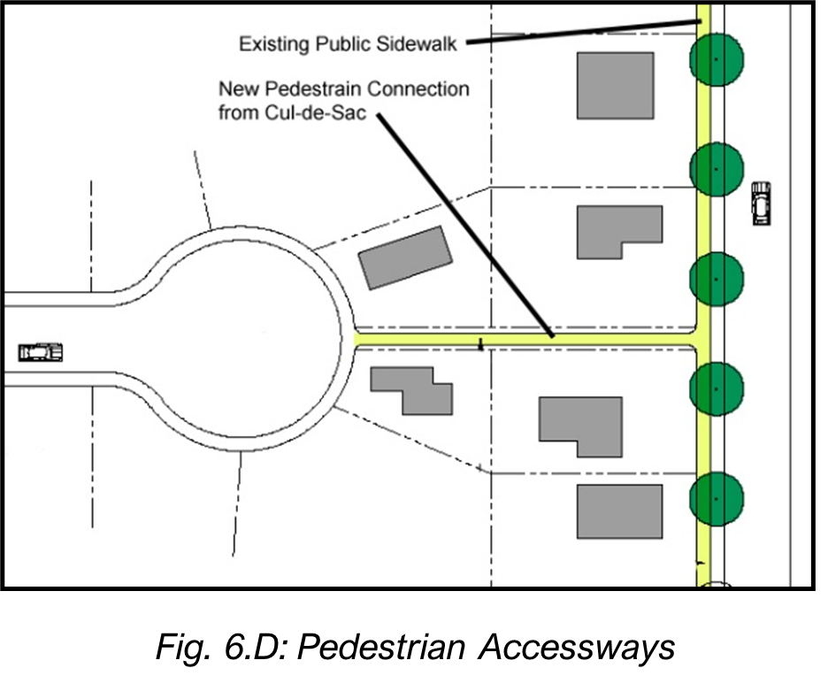 Whenever cul-de-sac streets are created, at least one ten-foot-wide pedestrian access easement shall be provided, to the maximum extent practicable, between each cul-de-sac head or street turnaround and the sidewalk system of the closest adjacent street, pedestrian sidewalk or trail/pathway. (See Figure 6.D: Pedestrian Accessways).