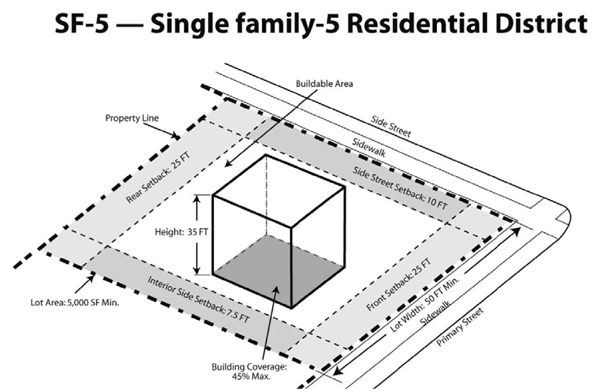 The intent and purpose of the single-family residential-5 district (SF-5) is to provide urban density single-family housing, and it is intended to serve as a transitional zone between multifamily and single-family residential uses.