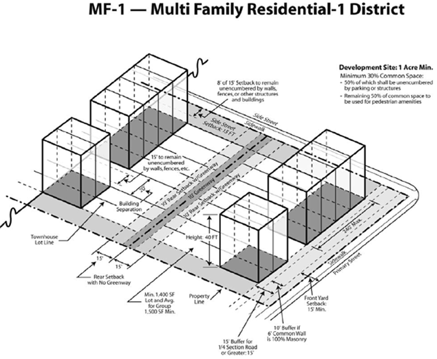 The intent and purpose of the multifamily residential-1 district (MF-1) is to provide a townhouse zoning district in order to permit separate ownership of one-family dwelling units upon compliance with certain rules, regulations and standards, and to authorize the grouping of separately owned one-family dwelling units into a group of townhouses in such a manner as to make efficient, economical and aesthetically pleasing use of land, so restricted that the same will be continually well-maintained in order to preserve the health, welfare, safety, morals and convenience of the neighborhood and surrounding area.