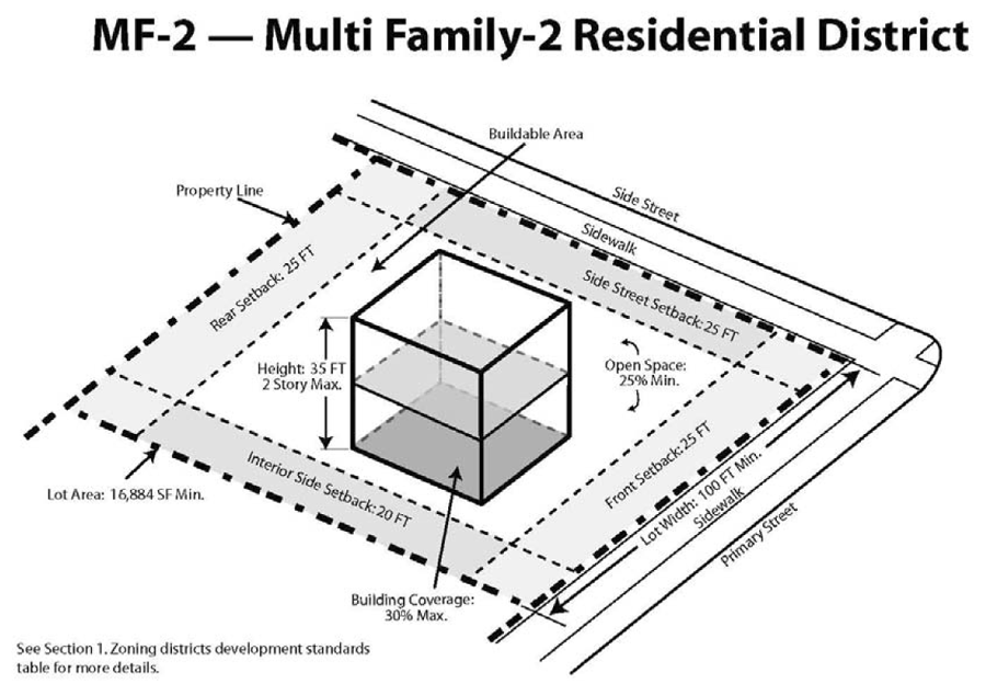The intent and purpose of the multifamily residential-2 district (MF-2) is to provide for residential districts allowing low-rise condominiums/apartments with moderate density.