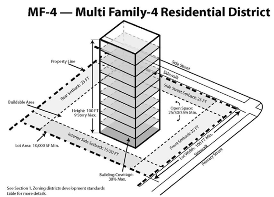 The intent and purpose of the multifamily residential-4 district (MF-4) is to provide for a residential district allowing mid- and high-rise condominiums/apartments with high density.